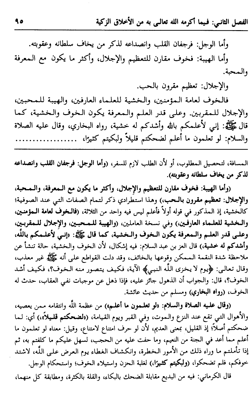"وأما الهيبة: فخوف مقارن للتعظيم والإجلال، وأكثر ما يكون مع المعرفة، والمحبة، والإجلال، تعظيم مقرون بالحب" وهذا الاستطرادي ذكر لتمام الصفات التي عند الصوفية؟ كالخشية؛ إذ المذكور في قوله أولًا: فاعلم ليس فيه واحد من الثلاثة، "فالخوف لعامة المؤمنين، والخشية للعلماء العارفين" وفي نسخة العاملين، "والهيبة للمحبين، والإجلال للمقربين، وعلى قدرالعلم والمعرفة يكون الخوف والخشية، كما قال -صلى الله عليه وسلم: "إني لأعلمكم بالله، وأشدكم له خشية" قال العز بن عبد السلام: فيه إشكال؛ لأن الخوف والخشية حالة تنشأ عن ملاحظة شدة النقمة الممكن وقوعها بالخائف، وقد دلت القواطع على أنه -صلى الله عليه وسلم- غير معذب، وقال تعالى: {يَوْمَ لا يُخْزِي اللَّهُ النَّبِيَّ} الآية، فكيف يتصور منه الخوف؟، فكيف أشد الخوف؟، قال: والجواب أن الذهول جائز عليه، فإذا ذهل عن موجبات نفي العقاب، حدث له الخوف، "رواه البخاري" ومسلم من حديث عائشة.