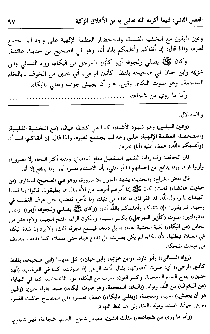 وكان -صلى الله عليه وسلم- يصلي ولجوفه أزيز كأزيز المرجل من البكاء، رواه النسائي وابن خزيمة وابن حبان في صحيحة بلفظ: كأنين الرحى، أي: خنين من الخوف -بالخاء المعجمة- وهو صوت البكاء. وقيل: هو أن يجيش جوف ويغلي بالبكاء.