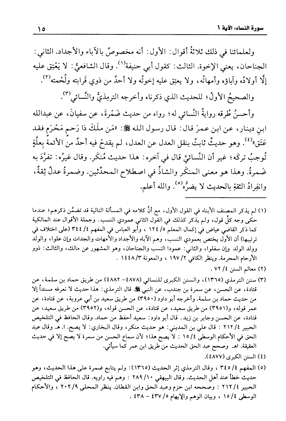 أَبَانُ بْنُ عُثْمَانَ: كَانَ الْكَاتِبُ يُمْلَى عَلَيْهِ فَيَكْتُبُ فَكَتَبَ" لكِنِ الرَّاسِخُونَ فِي الْعِلْمِ مِنْهُمْ وَالْمُؤْمِنُونَ" ثُمَّ قَالَ لَهُ: مَا أَكْتُبُ؟ فَقِيلَ لَهُ: اكْتُبْ" وَالْمُقِيمِينَ الصَّلاةَ" فَمِنْ ثَمَّ وَقَعَ هَذَا. قَالَ الْقُشَيْرِيُّ: وَهَذَا الْمَسْلَكُ بَاطِلٌ، لِأَنَّ الَّذِينَ جَمَعُوا الْكِتَابَ كَانُوا قُدْوَةً فِي اللُّغَةِ، فَلَا يُظَنُّ بِهِمْ أَنَّهُمْ يُدْرِجُونَ فِي الْقُرْآنِ مَا لَمْ يُنْزَلْ. وَأَصَحُّ هَذِهِ الْأَقْوَالِ قَوْلُ سِيبَوَيْهِ وَهُوَ قَوْلُ الْخَلِيلِ، وَقَوْلُ الْكِسَائِيِّ هُوَ اختيار القفال والطبري، [والله أعلم] «1»