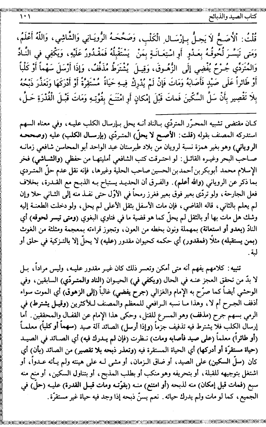 ـــــــــــــــــــــــــــــQكَانَ مُقْتَضَى تَشْبِيهِ الْمُحَرَّرِ الْمُتَرَدِّيَ بِالنَّادِّ أَنَّهُ يَحِلُّ بِإِرْسَالِ الْكَلْبِ عَلَيْهِ، وَفِي مَعْنَاهُ السَّهْمُ اسْتَدْرَكَهُ الْمُصَنِّفُ بِقَوْلِهِ (قُلْتُ: الْأَصَحُّ لَا يَحِلُّ) الْمُتَرَدِّي (بِإِرْسَالِ الْكَلْبِ) عَلَيْهِ (وَصَحَّحَهُ الرُّويَانِيُّ) وَهُوَ بِغَيْرِ هَمْزَةٍ نِسْبَةً لِرُويَانَ مِنْ بِلَادِ طَبَرِسْتَانَ عَبْدُ الْوَاحِدِ أَبُو الْمَحَاسِنِ شَافِعِيُّ زَمَانِهِ صَاحِبُ الْبَحْرِ وَغَيْرِهِ، الْقَائِلُ: لَوْ احْتَرَقَتْ كُتُبُ الشَّافِعِيِّ أَمْلَيْتُهَا مِنْ حِفْظِي (وَالشَّاشِيُّ) فَخْرُ الْإِسْلَامِ مُحَمَّدٌ أَبُو بَكْرِ بْنُ أَحْمَدَ بْنِ الْحُسَيْنِ صَاحِبُ الْحِلْيَةِ وَغَيْرِهَا، فَإِنَّهُ نَقَلَ عَدَمَ حِلِّ الْمُتَرَدِّي بِمَا ذَكَرَ عَنْ الرُّويَانِيِّ (وَاَللَّهُ أَعْلَمُ) . وَالْفَرْقُ أَنَّ الْحَدِيدَ يُسْتَبَاحُ بِهِ الذَّبْحُ مَعَ الْقُدْرَةِ، بِخِلَافِ فِعْلِ الْجَارِحَةِ، وَلَوْ تَرَدَّى بَعِيرٌ فَوْقَ بَعِيرٍ فَغَرَزَ رُمْحًا فِي الْأَوَّلِ حَتَّى نَفَذَ مِنْهُ إلَى الثَّانِي حَلَّا وَإِنْ لَمْ يَعْلَمْ بِالثَّانِي، قَالَهُ الْقَاضِي، فَإِنْ مَاتَ الْأَسْفَلُ بِثِقَلِ الْأَعْلَى لَمْ يَحِلَّ، وَلَوْ دَخَلَتْ الطَّعْنَةُ إلَيْهِ وَشَكَّ هَلْ مَاتَ بِهَا أَوْ بِالثِّقَلِ لَمْ يَحِلَّ كَمَا هُوَ قَضِيَّةُ مَا فِي فَتَاوَى الْبَغَوِيِّ (وَمَتَى تَيَسَّرَ لُحُوقُهُ) أَيْ النَّادِّ (بِعَدْوٍ أَوْ اسْتِعَانَةٍ) بِمُهْمَلَةٍ وَنُونٍ بِخَطِّهِ مِنْ الْعَوْنِ، وَتَجُوزُ قِرَاءَتُهُ بِمُعْجَمَةٍ وَمُثَلَّثَةٍ مِنْ الْغَوْثِ (بِمَنْ يَسْتَقْبِلُهُ) مَثَلًا (فَمَقْدُورٌ) أَيْ حُكْمُهُ كَحَيَوَانٍ مَقْدُورٍ (عَلَيْهِ) لَا يَحِلُّ إلَّا بِالتَّزْكِيَةِ فِي حَلْقٍ أَوْ لَبَّةٍ. تَنْبِيهٌ: كَلَامُهُمْ يُفْهِمُ أَنَّهُ مَتَى أَمْكَنَ وَتَعَسَّرَ ذَلِكَ كَانَ غَيْرَ مَقْدُورٍ عَلَيْهِ، وَلَيْسَ مُرَادًا، بَلْ لَا بُدَّ مِنْ تَحَقُّقِ الْعَجْزِ عَنْهُ فِي الْحَالِ (وَيَكْفِي فِي) الْحَيَوَانِ (النَّادِّ وَالْمُتَرَدِّي) السَّابِقَيْنِ، وَفِي الْوَحْشِيِّ أَيْضًا كَمَا صَرَّحَ بِهِ الْإِمَامُ وَالْغَزَالِيُّ (جُرْحٌ يُفْضِي) غَالِبًا (إلَى الزُّهُوقِ) أَيْ الْمَوْتِ سَوَاءٌ أَذُفِّفَ الْجُرْحُ أَمْ لَا، وَهَذَا مَا نَسَبَهُ الرَّافِعِيُّ لِلْمُعْظَمِ وَالْمُصَنِّفُ لِلْأَكْثَرِينَ (وَقِيلَ يُشْتَرَطُ) فِي الرَّمْيِ بِسَهْمٍ جُرْحٌ (مُذَفِّفٌ) وَهُوَ الْمُسْرِعُ لِلْقَتْلِ، وَحَكَى هَذَا الْإِمَامُ عَنْ الْقَفَّالِ وَالْمُحَقِّقِينَ. أَمَّا إرْسَالُ الْكَلْبِ فَلَا يُشْتَرَطُ فِيهِ تَذْفِيفٌ جَزْمًا.
