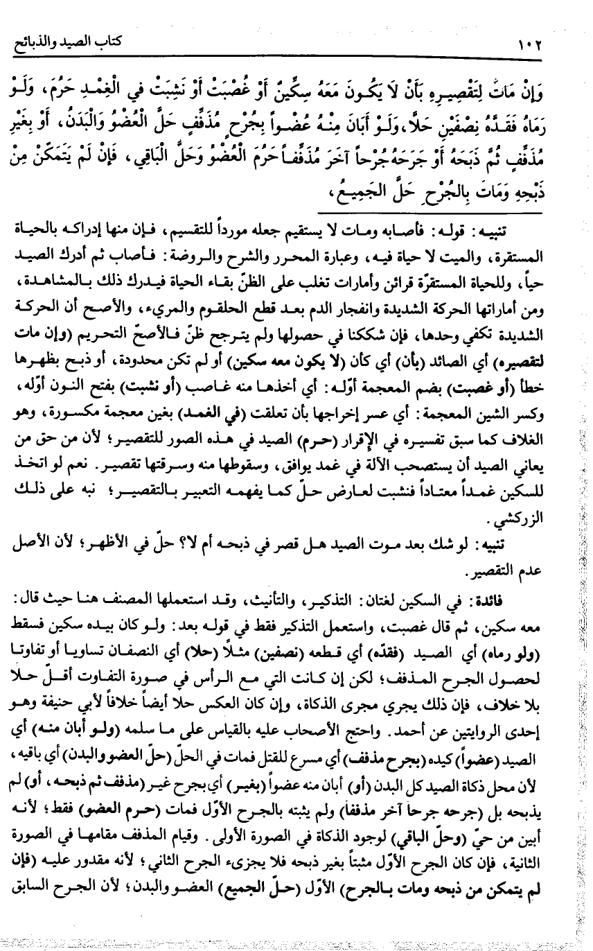 ـــــــــــــــــــــــــــــQتَنْبِيهٌ: قَوْلُهُ: فَأَصَابَهُ وَمَاتَ لَا يَسْتَقِيمُ جَعْلُهُ مَوْرِدًا لِلتَّقْسِيمِ، فَإِنَّ مِنْهَا إدْرَاكَهُ بِالْحَيَاةِ الْمُسْتَقِرَّةِ، وَالْمَيْتُ لَا حَيَاةَ فِيهِ، وَعِبَارَةُ الْمُحَرَّرِ وَالشَّرْحِ وَالرَّوْضَةِ: فَأَصَابَ ثُمَّ أَدْرَكَ الصَّيْدَ حَيًّا، وَلِلْحَيَاةِ الْمُسْتَقِرَّةِ قَرَائِنُ وَأَمَارَاتٌ تُغَلِّبُ عَلَى الظَّنِّ بَقَاءَ الْحَيَاةِ فَيُدْرَكُ ذَلِكَ بِالْمُشَاهَدَةِ، وَمِنْ أَمَارَاتِهَا الْحَرَكَةُ الشَّدِيدَةُ وَانْفِجَارُ الدَّمِ بَعْدَ قَطْعِ الْحُلْقُومِ وَالْمَرِيءِ، وَالْأَصَحُّ أَنَّ الْحَرَكَةَ الشَّدِيدَةَ تَكْفِي وَحْدَهَا، فَإِنْ شَكَكْنَا فِي حُصُولِهَا وَلَمْ يَتَرَجَّحْ ظَنٌّ فَالْأَصَحُّ التَّحْرِيمُ (وَإِنْ مَاتَ لِتَقْصِيرِهِ) أَيْ الصَّائِدِ (بِأَنْ) أَيْ كَأَنْ (لَا يَكُونَ مَعَهُ سِكِّينٌ) أَوْ لَمْ تَكُنْ مَحْدُودَةً، أَوْ ذَبَحَ بِظَهْرِهَا خَطَأً (أَوْ غُصِبَتْ) بِضَمِّ الْمُعْجَمَةِ أَوَّلَهُ: أَيْ أَخَذَهَا مِنْهُ غَاصِبٌ (أَوْ نَشِبَتْ) بِفَتْحِ النُّونِ أَوَّلَهُ، وَكَسْرِ الشِّينِ الْمُعْجَمَةِ: أَيْ عَسُرَ إخْرَاجُهَا بِأَنْ تَعَلَّقَتْ (فِي الْغِمْدِ) بِغَيْنٍ مُعْجَمَةٍ مَكْسُورَةٍ، وَهُوَ الْغِلَافُ كَمَا سَبَقَ تَفْسِيرُهُ فِي الْإِقْرَارِ (حَرُمَ) الصَّيْدُ فِي هَذِهِ الصُّوَرِ لِلتَّقْصِيرِ؛ لِأَنَّ مِنْ حَقِّ مَنْ يُعَانِي الصَّيْدَ أَنْ يَسْتَصْحِبَ الْآلَةَ فِي غِمْدٍ يُوَافِقُ، وَسُقُوطُهَا مِنْهُ وَسَرِقَتُهَا تَقْصِيرٌ. نَعَمْ لَوْ اتَّخَذَ لِلسِّكِّينِ غِمْدًا مُعْتَادًا فَنَشِبَتْ لِعَارِضٍ حَلَّ كَمَا يُفْهِمُهُ التَّعْبِيرُ بِالتَّقْصِيرِ؛ نَبَّهَ عَلَى ذَلِكَ الزَّرْكَشِيُّ.
