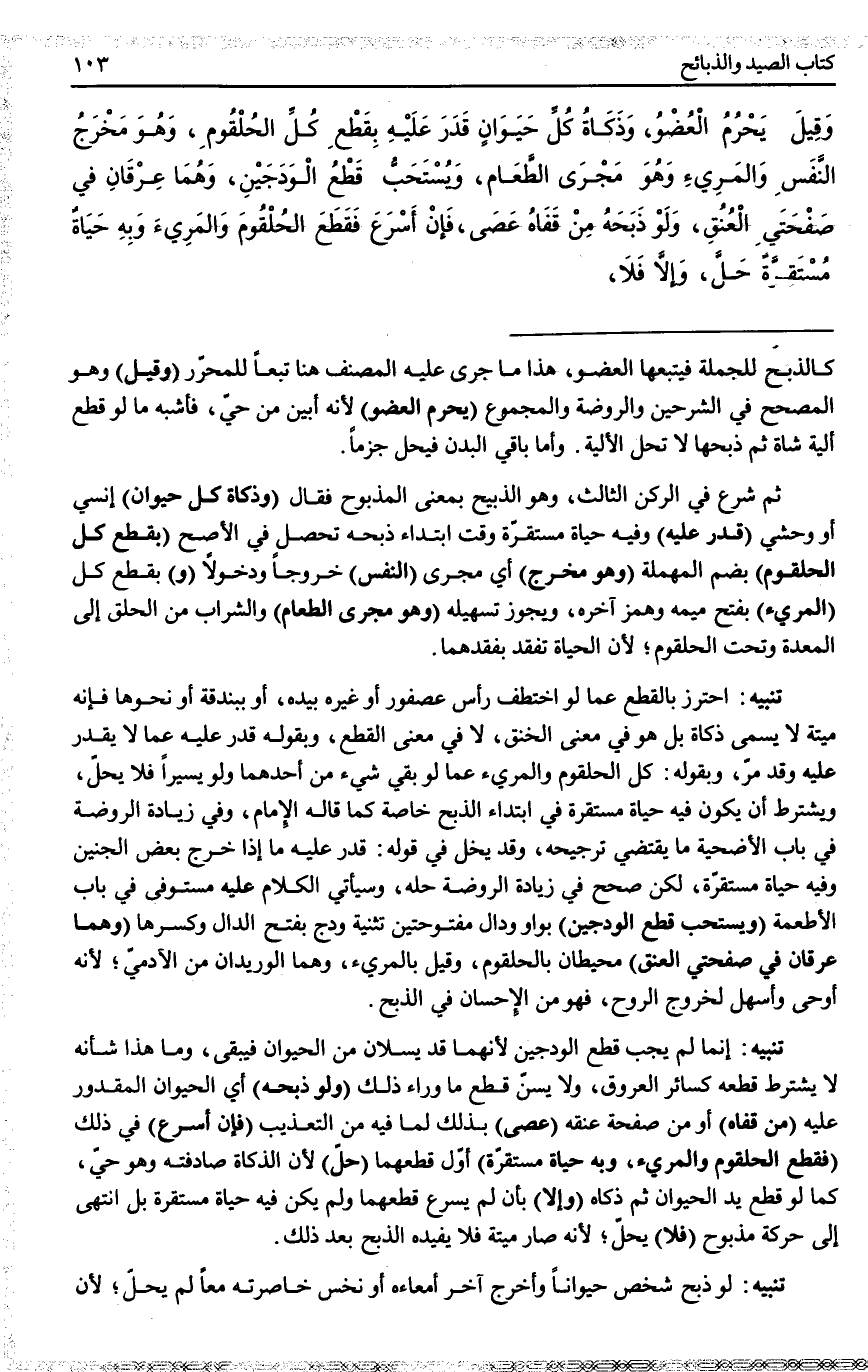 ثُمَّ شَرَعَ فِي الرُّكْنِ الثَّالِثِ، وَهُوَ الذَّبِيحُ بِمَعْنَى الْمَذْبُوحِ فَقَالَ (وَذَكَاةُ كُلِّ حَيَوَانٍ) إنْسِيٍّ أَوْ وَحْشِيٍّ (قُدِرَ عَلَيْهِ) وَفِيهِ حَيَاةٌ مُسْتَقِرَّةٌ وَقْتَ ابْتِدَاءِ ذَبْحِهِ تَحْصُلُ فِي الْأَصَحِّ (بِقَطْعِ كُلِّ الْحُلْقُومِ) بِضَمِّ الْمُهْمَلَةِ (وَهُوَ مَخْرَجُ) أَيْ مَجْرَى (النَّفَسِ) خُرُوجًا وَدُخُولًا (وَ) بِقَطْعِ كُلِّ (الْمَرِيءِ) بِفَتْحِ مِيمِهِ وَهَمْزِ آخِرِهِ، وَيَجُوزُ تَسْهِيلُهُ (وَهُوَ مَجْرَى الطَّعَامِ) وَالشَّرَابِ مِنْ الْحَلْقِ إلَى الْمَعِدَةِ وَتَحْتَ الْحُلْقُومِ؛ لِأَنَّ الْحَيَاةَ تُفْقَدُ بِفَقْدِهِمَا.