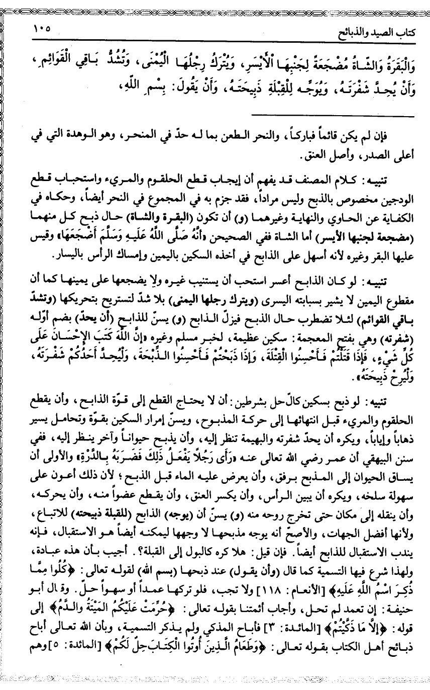تَنْبِيهٌ: لَوْ ذَبَحَ بِسِكِّينٍ كَالٍّ حَلَّ بِشَرْطَيْنِ: أَنْ لَا يَحْتَاجَ الْقَطْعُ إلَى قُوَّةِ الذَّابِحِ، وَأَنْ يَقْطَعَ الْحُلْقُومَ وَالْمَرِيءَ قَبْلَ انْتِهَائِهَا إلَى حَرَكَةِ الْمَذْبُوحِ، وَيُسَنُّ إمْرَارُ السِّكِّينِ بِقُوَّةِ تَحَامُلٍ يَسِيرٍ ذَهَابًا وَإِيَابًا، وَيُكْرَهُ أَنْ يَحُدَّ شَفْرَتَهُ وَالْبَهِيمَةُ تَنْظُرُ إلَيْهِ، وَأَنْ يَذْبَحَ حَيَوَانًا وَآخَرُ يَنْظُرُ إلَيْهِ، فَفِي سُنَنِ الْبَيْهَقِيّ أَنَّ عُمَرَ - رَضِيَ اللَّهُ تَعَالَى عَنْهُ - " رَأَى رَجُلًا يَفْعَلُ ذَلِكَ فَضَرَبَهُ بِالدِّرَّةِ " وَالْأَوْلَى أَنْ يُسَاقَ الْحَيَوَانُ إلَى الْمَذْبَحِ بِرِفْقٍ، وَأَنْ يُعْرَضَ عَلَيْهِ الْمَاءُ قَبْلَ الذَّبْحِ؛ لِأَنَّ ذَلِكَ أَعْوَنُ عَلَى سُهُولَةِ سَلْخِهِ، وَيُكْرَهُ أَنْ يُبِينَ الرَّأْسَ، وَأَنْ يَكْسِرَ الْعُنُقَ، وَأَنْ يَقْطَعَ عُضْوًا مِنْهُ، وَأَنْ يُحَرِّكَهُ، وَأَنْ يَنْقُلَهُ إلَى مَكَانٍ حَتَّى تَخْرُجَ رُوحُهُ مِنْهُ (وَ) يُسَنُّ أَنْ (يُوَجِّهَ) الذَّابِحُ (لِلْقِبْلَةِ ذَبِيحَتَهُ) لِلِاتِّبَاعِ، وَلِأَنَّهَا أَفْضَلُ الْجِهَاتِ، وَالْأَصَحُّ أَنَّهُ يُوَجِّهُ مَذْبَحَهَا لَا وَجْهَهَا لِيُمْكِنَهُ أَيْضًا هُوَ الِاسْتِقْبَالُ، فَإِنَّهُ يُنْدَبُ الِاسْتِقْبَالُ لِلذَّابِحِ أَيْضًا. فَإِنْ قِيلَ: هَلَّا كُرِهَ كَالْبَوْلِ إلَى الْقِبْلَةِ؟ .