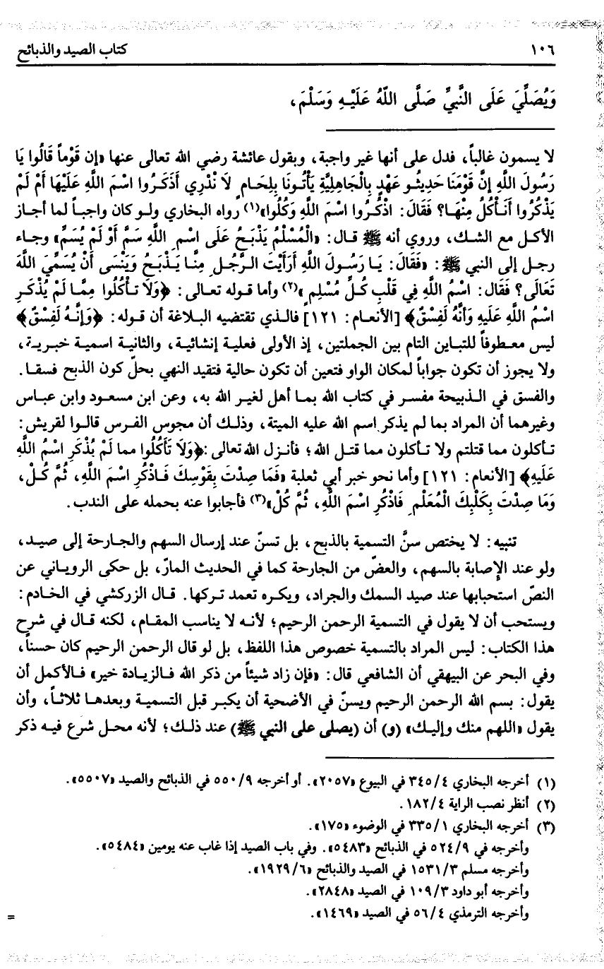 تَنْبِيهٌ: لَا يَخْتَصُّ سَنُّ التَّسْمِيَةِ بِالذَّبْحِ، بَلْ تُسَنُّ عِنْدَ إرْسَالِ السَّهْمِ وَالْجَارِحَةِ إلَى صَيْدٍ، وَلَوْ عِنْدَ الْإِصَابَةِ بِالسَّهْمِ، وَالْعَضِّ مِنْ الْجَارِحَةِ كَمَا فِي الْحَدِيثِ الْمَارِّ، بَلْ حَكَى الرُّويَانِيُّ عَنْ النَّصِّ اسْتِحْبَابَهَا عِنْدَ صَيْدِ السَّمَكِ وَالْجَرَادِ، وَيُكْرَهُ تَعَمُّدُ تَرْكِهَا. قَالَ الزَّرْكَشِيُّ فِي الْخَادِمِ: وَيُسْتَحَبُّ أَنْ لَا يَقُولَ فِي التَّسْمِيَةِ: " الرَّحْمَنِ الرَّحِيمِ "؛ لِأَنَّهُ لَا يُنَاسِبُ الْمَقَامَ، لَكِنَّهُ قَالَ فِي شَرْحِ هَذَا الْكِتَابِ: لَيْسَ الْمُرَادُ بِالتَّسْمِيَةِ خُصُوصُ هَذَا اللَّفْظِ، بَلْ لَوْ قَالَ: " الرَّحْمَنِ الرَّحِيمِ " كَانَ حَسَنًا، وَفِي الْبَحْرِ عَنْ الْبَيْهَقِيّ أَنَّ الشَّافِعِيَّ قَالَ: " فَإِنْ زَادَ شَيْئًا مِنْ ذِكْرِ اللَّهِ فَالزِّيَادَةُ خَيْرٌ " فَالْأَكْمَلُ أَنْ يَقُولَ: بِسْمِ اللَّهِ الرَّحْمَنِ الرَّحِيمِ وَيُسَنُّ فِي الْأُضْحِيَّةِ أَنْ يُكَبِّرَ قَبْلَ التَّسْمِيَةِ وَبَعْدَهَا ثَلَاثًا، وَأَنْ يَقُولَ " اللَّهُمَّ مِنْك وَإِلَيْك " (وَ) أَنْ (يُصَلِّيَ عَلَى النَّبِيِّ - صَلَّى اللَّهُ عَلَيْهِ وَسَلَّمَ -) عِنْدَ ذَلِكَ؛ لِأَنَّهُ مَحَلٌّ شُرِعَ فِيهِ ذِكْرُ
