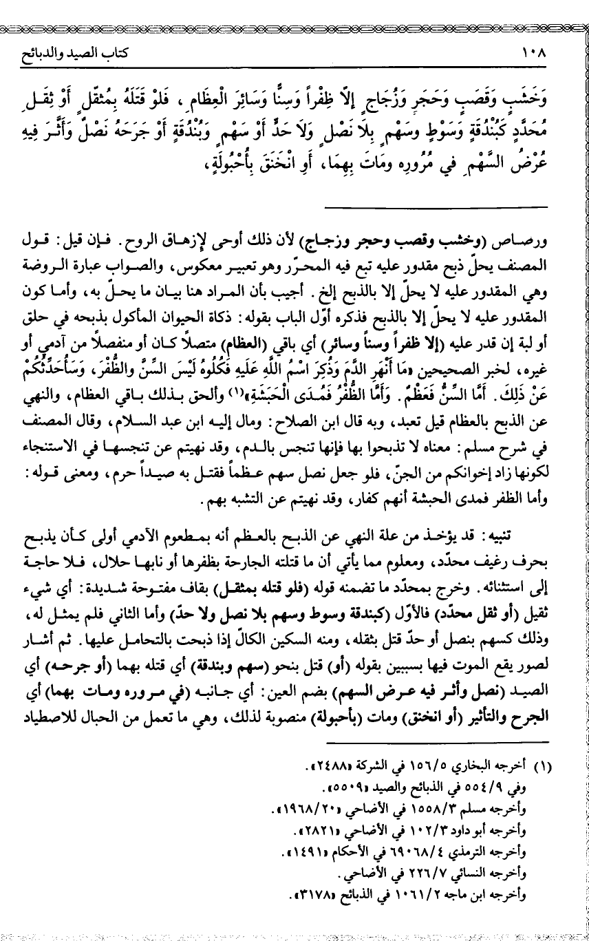 (إلَّا ظُفْرًا وَسِنًّا وَسَائِرَ) أَيْ بَاقِي (الْعِظَامِ) مُتَّصِلًا كَانَ أَوْ مُنْفَصِلًا مِنْ آدَمِيٍّ أَوْ غَيْرِهِ، لِخَبَرِ الصَّحِيحَيْنِ «مَا أَنْهَرَ الدَّمَ وَذُكِرَ اسْمُ اللَّهِ عَلَيْهِ فَكُلُوهُ لَيْسَ السِّنَّ وَالظُّفْرَ، وَسَأُحَدِّثُكُمْ عَنْ ذَلِكَ. أَمَّا السِّنُّ فَعَظْمٌ. وَأَمَّا الظُّفْرُ فَمُدَى الْحَبَشَةِ» وَأُلْحِقَ بِذَلِكَ بَاقِي الْعِظَامِ، وَالنَّهْيُ عَنْ الذَّبْحِ بِالْعِظَامِ قِيلَ تَعَبُّدٌ، وَبِهِ قَالَ ابْنُ الصَّلَاحِ: وَمَالَ إلَيْهِ ابْنُ عَبْدِ السَّلَامِ، وَقَالَ الْمُصَنِّفُ فِي شَرْحِ مُسْلِمٍ: مَعْنَاهُ لَا تَذْبَحُوا بِهَا فَإِنَّهَا تَنْجَسُ بِالدَّمِ، وَقَدْ نُهِيتُمْ عَنْ تَنَجُّسِهَا فِي الِاسْتِنْجَاءِ لِكَوْنِهَا زَادَ إخْوَانِكُمْ مِنْ الْجِنِّ، فَلَوْ جَعَلَ نَصْلَ سَهْمٍ عَظْمًا فَقَتَلَ بِهِ صَيْدًا حَرُمَ، وَمَعْنَى قَوْلِهِ: وَأَمَّا الظُّفْرُ فَمُدَى الْحَبَشَةِ أَنَّهُمْ كُفَّارٌ، وَقَدْ نُهِيتُمْ عَنْ التَّشَبُّهِ بِهِمْ.