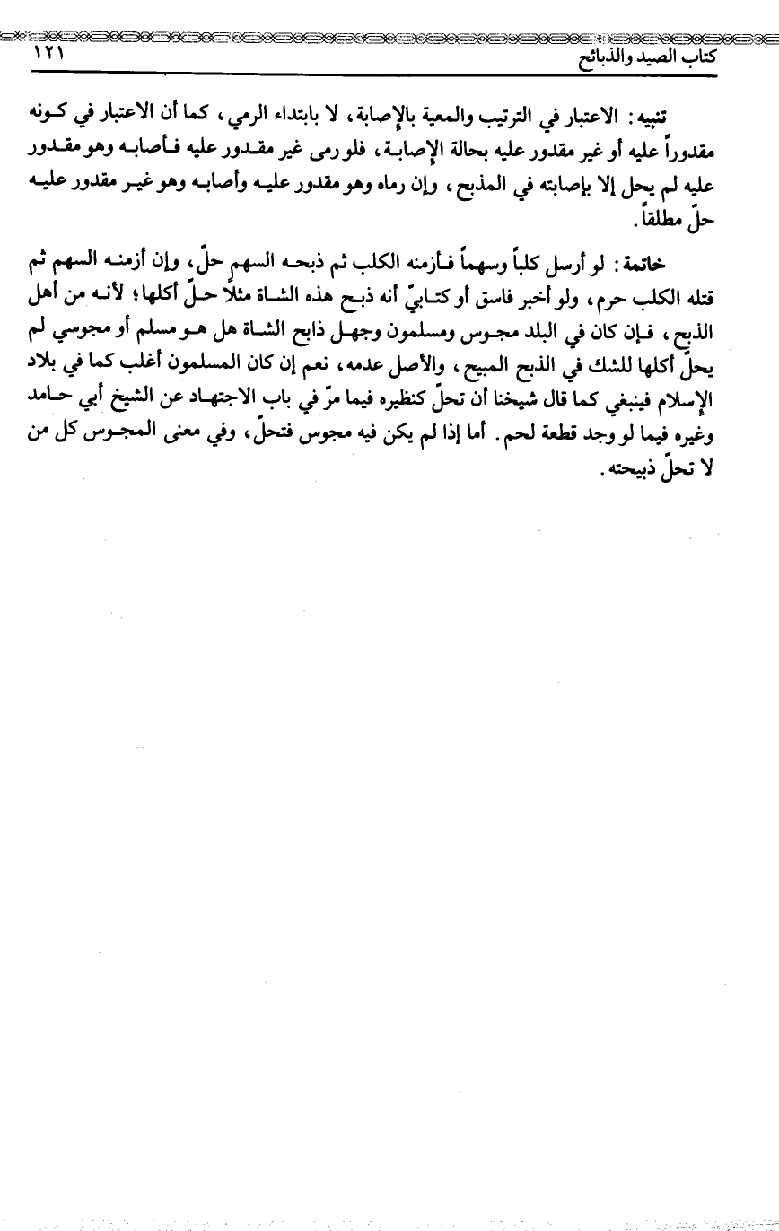 خَاتِمَةٌ: لَوْ أَرْسَلَ كَلْبًا وَسَهْمًا فَأَزْمَنَهُ الْكَلْبُ ثُمَّ ذَبَحَهُ السَّهْمُ حَلَّ، وَإِنْ أَزْمَنَهُ. السَّهْمُ ثُمَّ قَتَلَهُ الْكَلْبُ حَرُمَ، وَلَوْ أَخْبَرَ فَاسِقٌ أَوْ كِتَابِيٌّ أَنَّهُ ذَبَحَ هَذِهِ الشَّاةَ مَثَلًا حَلَّ أَكْلُهَا؛ لِأَنَّهُ مِنْ أَهْلِ الذَّبْحِ، فَإِنْ كَانَ فِي الْبَلَدِ مَجُوسٌ وَمُسْلِمُونَ وَجُهِلَ ذَابِحُ الشَّاةِ هَلْ هُوَ مُسْلِمٌ أَوْ مَجُوسِيٌّ لَمْ يَحِلَّ أَكْلُهَا لِلشَّكِّ فِي الذَّبْحِ الْمُبِيحِ، وَالْأَصْلُ عَدَمُهُ، نَعَمْ إنْ كَانَ الْمُسْلِمُونَ أَغْلَبَ كَمَا فِي بِلَادِ الْإِسْلَامِ فَيَنْبَغِي كَمَا قَالَ شَيْخُنَا أَنْ تَحِلَّ كَنَظِيرِهِ فِيمَا مَرَّ فِي بَابِ الِاجْتِهَادِ عَنْ الشَّيْخِ أَبِي حَامِدٍ وَغَيْرِهِ فِيمَا لَوْ وَجَدَ قِطْعَةَ لَحْمٍ. أَوْ إذَا لَمْ يَكُنْ فِيهِ مَجُوسٌ فَتَحِلُّ، وَفِي مَعْنَى الْمَجُوسِ كُلُّ مَنْ لَا تَحِلُّ ذَبِيحَتُهُ.