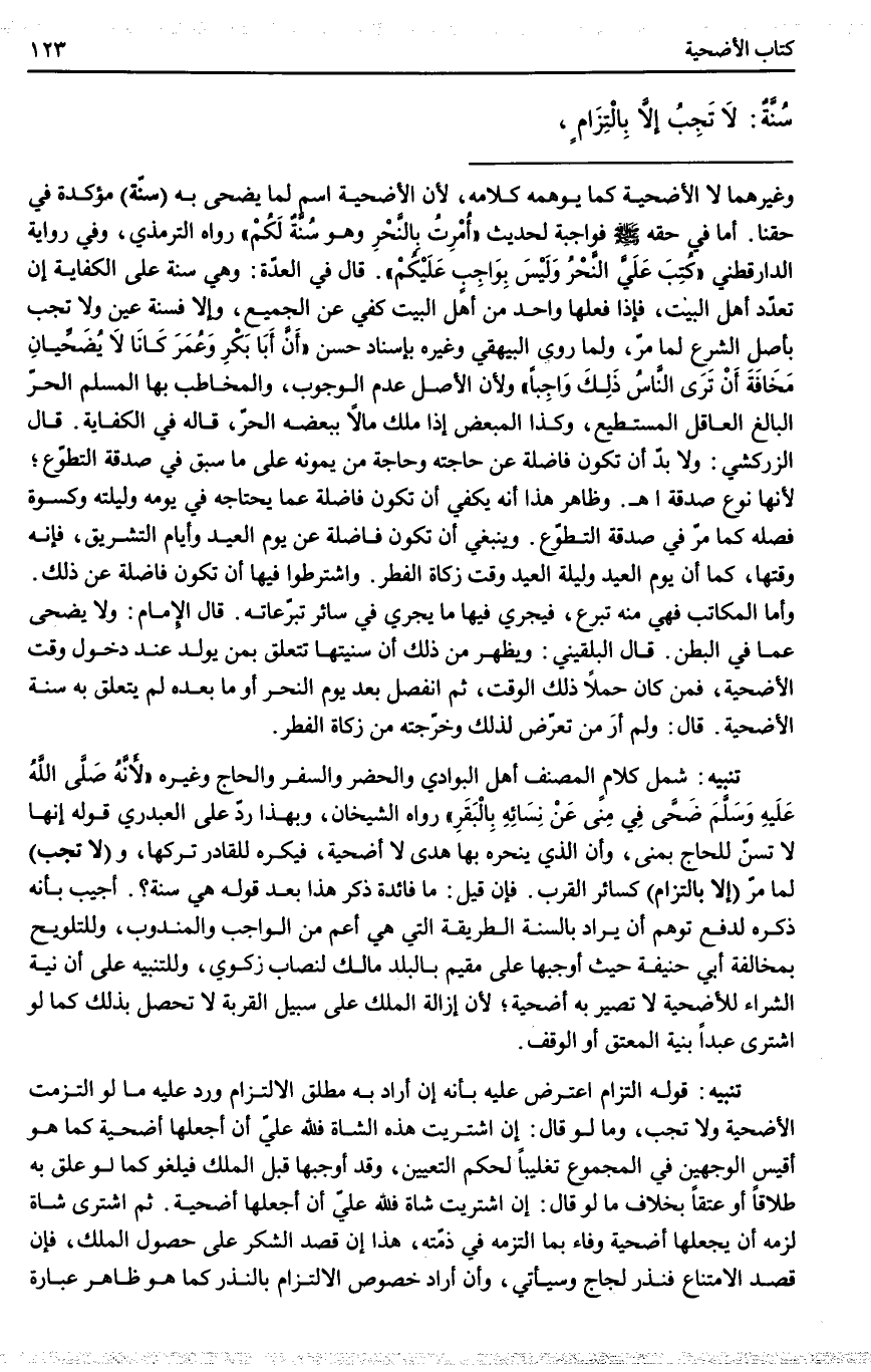 وَبِهَذَا رُدَّ عَلَى الْعَبْدَرِيِّ قَوْلُهُ إنَّهَا لَا تُسَنُّ لِلْحَاجِّ بِمِنًى، وَأَنَّ الَّذِي يَنْحَرُهُ بِهَا هَدْيٌ لَا أُضْحِيَّةٌ، فَيُكْرَهُ لِلْقَادِرِ تَرْكُهَا، وَ (لَا تَجِبُ) لِمَا مَرَّ (إلَّا بِالْتِزَامٍ) كَسَائِرِ الْقُرَبِ. فَإِنْ قِيلَ: مَا فَائِدَةُ ذِكْرِ هَذَا بَعْدَ قَوْلِهِ هِيَ سُنَّةٌ؟ .