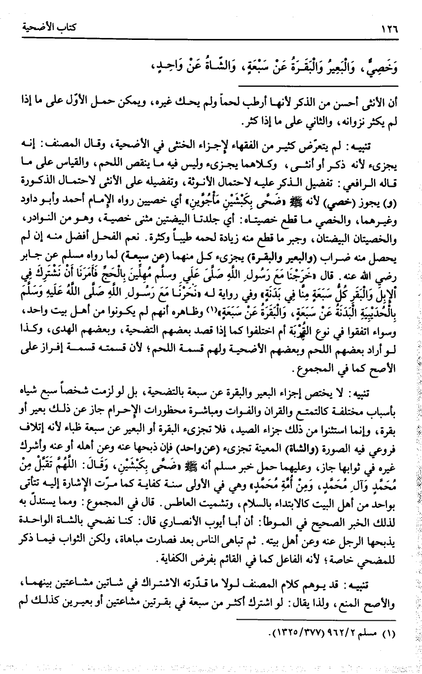 تَنْبِيهٌ: لَا يَخْتَصُّ إجْزَاءُ الْبَعِيرِ وَالْبَقَرَةِ عَنْ سَبْعَةٍ بِالتَّضْحِيَةِ، بَلْ لَوْ لَزِمَتْ شَخْصًا سَبْعُ شِيَاهٍ بِأَسْبَابٍ مُخْتَلِفَةٍ كَالتَّمَتُّعِ وَالْقِرَانِ وَالْفَوَاتِ وَمُبَاشَرَةِ مَحْظُورَاتِ الْإِحْرَامِ جَازَ عَنْ ذَلِكَ بَعِيرٌ أَوْ بَقَرَةٌ، وَإِنَّمَا اسْتَثْنَوْا مِنْ ذَلِكَ جَزَاءَ الصَّيْدِ، فَلَا تُجْزِئُ الْبَقَرَةُ أَوْ الْبَعِيرُ عَنْ سَبْعَةِ ظِبَاءٍ؛ لِأَنَّهُ إتْلَافٌ فَرُوعِيَ فِيهِ الصُّورَةُ.