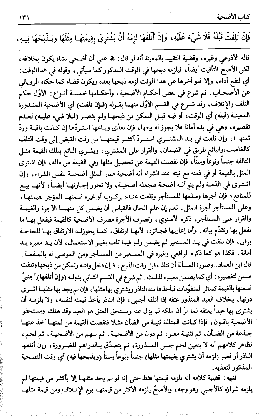 ثُمَّ شَرَعَ فِي بَعْضِ أَحْكَامِ الْأُضْحِيَّةِ، وَأَحْكَامُهَا خَمْسَةُ أَنْوَاعٍ: الْأَوَّلُ حُكْمُ التَّلَفِ وَالْإِتْلَافِ، وَقَدْ شَرَعَ فِي الْقِسْمِ الْأَوَّلِ مِنْهُمَا بِقَوْلِهِ (فَإِنْ تَلِفَتْ) أَيْ الْأُضْحِيَّةُ الْمَنْذُورَةُ الْمُعَيَّنَةُ (قَبْلَهُ) أَيْ الْوَقْتِ، أَوْ فِيهِ قَبْلَ التَّمَكُّنِ مِنْ ذَبْحِهَا وَلَمْ يُقَصِّرْ (فَلَا شَيْءَ عَلَيْهِ) لِعَدَمِ تَقْصِيرِهِ، وَهِيَ فِي يَدِهِ أَمَانَةٌ فَلَا يَجُوزُ لَهُ بَيْعُهَا، فَإِنْ تَعَدَّى وَبَاعَهَا اسْتَرَدَّهَا إنْ كَانَتْ بَاقِيَةً وَرَدَّ ثَمَنَهَا، وَإِنْ تَلِفَتْ فِي يَدِ الْمُشْتَرِي اسْتَرَدَّ أَكْثَرَ قِيمَتِهَا مِنْ وَقْتِ الْقَبْضِ إلَى وَقْتِ التَّلَفِ كَالْغَاصِبِ، وَالْبَائِعُ طَرِيقٌ فِي الضَّمَانِ، وَالْقَرَارُ عَلَى الْمُشْتَرِي، وَيَشْتَرِي الْبَائِعُ بِتِلْكَ الْقِيمَةِ مِثْلَ التَّالِفَةِ جِنْسًا وَنَوْعًا وَسِنًّا، فَإِنْ نَقَصَتْ الْقِيمَةُ عَنْ تَحْصِيلِ مِثْلِهَا وَفَّى الْقِيمَةَ مِنْ مَالِهِ، فَإِنْ اشْتَرَى الْمِثْلَ بِالْقِيمَةِ أَوْ فِي ذِمَّتِهِ مَعَ نِيَّتِهِ عِنْدَ الشِّرَاءِ أَنَّهُ أُضْحِيَّةٌ صَارَ الْمِثْلُ أُضْحِيَّةً بِنَفْسِ الشِّرَاءِ، وَإِنْ اشْتَرَى فِي الذِّمَّةِ وَلَمْ يَنْوِ أَنَّهُ أُضْحِيَّةٌ فَيَجْعَلُهُ أُضْحِيَّةً، وَلَا تَجُوزُ إجَارَتُهَا أَيْضًا؛ لِأَنَّهَا بَيْعٌ لِلْمَنَافِعِ؛ فَإِنْ أَجَرَهَا وَسَلَّمَهَا لِلْمُسْتَأْجِرِ وَتَلِفَتْ عِنْدَهُ بِرُكُوبٍ أَوْ غَيْرِهِ ضَمِنَهَا الْمُؤَجِّرُ بِقِيمَتِهَا، وَعَلَى الْمُسْتَأْجِرِ أُجْرَةُ الْمِثْلِ. نَعَمْ إنْ عَلِمَ الْحَالَ فَالْقِيَاسُ أَنْ يَضْمَنَ كُلٌّ مِنْهُمَا الْأُجْرَةَ وَالْقِيمَةَ. وَالْقَرَارُ عَلَى الْمُسْتَأْجِرِ، ذَكَرَهُ الْإِسْنَوِيُّ، وَتُصْرَفُ الْأُجْرَةُ مَصْرِفَ الْأُضْحِيَّةِ كَالْقِيمَةِ فَيَفْعَلُ بِهَا مَا يُفْعَلُ بِهَا وَتَقَدَّمَ بَيَانُهُ. وَأَمَّا إعَارَتُهَا فَجَائِزَةٌ؛ لِأَنَّهَا ارْتِفَاقٌ، كَمَا يَجُوزُ لَهُ الِارْتِفَاقُ بِهَا لِلْحَاجَةِ بِرِفْقٍ، فَإِنْ تَلِفَتْ فِي يَدِ الْمُسْتَعِيرِ لَمْ يَضْمَنْ وَلَوْ فِيمَا تَلِفَ بِغَيْرِ الِاسْتِعْمَالِ؛ لِأَنَّ يَدَ مُعِيرِهِ يَدُ أَمَانَةٍ، فَكَذَا هُوَ كَمَا ذَكَرَهُ الرَّافِعِيُّ وَغَيْرُهُ فِي الْمُسْتَعِيرِ مِنْ الْمُسْتَأْجِرِ وَمِنْ الْمُوصَى لَهُ بِالْمَنْفَعَةِ. قَالَ ابْنُ الْعِمَادِ: وَصُورَةُ الْمَسْأَلَةِ أَنْ تَتْلَفَ قَبْلَ وَقْتِ الذَّبْحِ، فَإِنْ دَخَلَ وَقْتُهُ وَتَمَكَّنَ مِنْ ذَبْحِهَا وَتَلِفَتْ ضَمِنَ لِتَقْصِيرِهِ: أَيْ كَمَا يَضْمَنُ مُعِيرُهُ لِذَلِكَ.