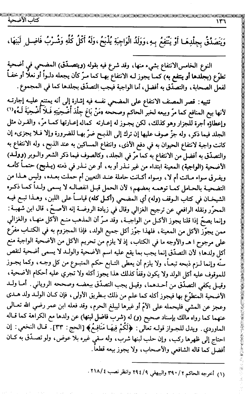 تَنْبِيهٌ: قَصْرُ الْمُصَنِّفِ الِانْتِفَاعَ عَلَى الْمُضَحِّي نَفْسِهِ فِيهِ إشَارَةٌ إلَى أَنَّهُ يَمْتَنِعُ عَلَيْهِ إجَارَتُهُ؛ لِأَنَّهَا بَيْعُ الْمَنَافِعِ كَمَا مَرَّ وَبَيْعُهُ لِخَبَرِ الْحَاكِمِ وَصَحَّحَهُ «مَنْ بَاعَ جِلْدَ أُضْحِيَّتِهِ فَلَا أُضْحِيَّةَ لَهُ» وَإِعْطَاؤُهُ أُجْرَةً لِلْجَزَّارِ وَهُوَ كَذَلِكَ، لَكِنْ يَجُوزُ لَهُ إعَارَتُهُ كَمَا لَهُ إعَارَتُهَا كَمَا مَرَّ، وَالْقَرْنُ مِثْلُ الْجِلْدِ فِيمَا ذُكِرَ، وَلَهُ جَزُّ صُوفٍ عَلَيْهَا إنْ تُرِكَ إلَى الذَّبْحِ ضَرَّ بِهَا لِلضَّرُورَةِ وَإِلَّا فَلَا يُجْزِئُ إنْ كَانَتْ وَاجِبَةً لِانْتِفَاعِ الْحَيَوَانِ بِهِ فِي دَفْعِ الْأَذَى، وَانْتِفَاعِ الْمَسَاكِينِ بِهِ عِنْدَ الذَّبْحِ، وَلَهُ الِانْتِفَاعُ بِهِ، وَالتَّصَدُّقُ بِهِ أَفْضَلُ مِنْ الِانْتِفَاعِ بِهِ كَمَا مَرَّ فِي الْجِلْدِ، وَكَالصُّوفِ فِيمَا ذُكِرَ الشَّعْرُ وَالْوَبَرُ (وَوَلَدُ) الْأُضْحِيَّةِ (الْوَاجِبَةِ) الْمُعَيَّنَةِ ابْتِدَاءً مِنْ غَيْرِ نَذْرٍ أَوْ بِهِ، أَوْ عَنْ نَذْرٍ فِي ذِمَّتِهِ (يُذْبَحُ) حَتْمًا كَأُمِّهِ وَيُفَرَّقُ سَوَاءٌ مَاتَتْ أَمْ لَا، وَسَوَاءٌ أَكَانَتْ حَامِلَةً عِنْدَ التَّعْيِينِ أَمْ حَمَلَتْ بَعْدَهُ، وَلَيْسَ هَذَا مِنْ التَّضْحِيَةِ بِالْحَامِلِ كَمَا تَوَهَّمَهُ بَعْضُهُمْ؛ لِأَنَّ الْحَمْلَ قَبْلَ انْفِصَالِهِ لَا يُسَمَّى وَلَدًا كَمَا ذَكَرَهُ الشَّيْخَانِ فِي كِتَابِ الْوَقْفِ (وَلَهُ) أَيْ الْمُضَحِّي (أَكْلُ كُلِّهِ) قِيَاسًا عَلَى اللَّبَنِ، وَهَذَا تَبِعَ فِيهِ الْمُحَرَّرَ وَنَقَلَهُ الرَّافِعِيُّ عَنْ تَرْجِيحِ الْغَزَالِيِّ وَقَالَ فِي زِيَادَةِ الرَّوْضَةِ إنَّهُ الْأَصَحُّ، قَالَ ابْنُ شُهْبَةَ: وَإِنَّمَا يَصِحُّ إذَا قُلْنَا يَجُوزُ الْأَكْلُ مِنْ الْوَاجِبَةِ، وَقَدْ مَرَّ أَنَّ الْمَذْهَبَ مَنْعُ الْأَكْلِ مِنْهَا، وَالْغَزَالِيُّ مِمَّنْ يُجَوِّزُ الْأَكْلَ مِنْ الْمُعَيَّنَةِ، فَلِهَذَا جَوَّزَ أَكْلَ جَمِيعِ الْوَلَدِ، فَإِذًا الْمَجْزُومُ بِهِ فِي الْكِتَابِ مُفَرَّعٌ عَلَى مَرْجُوحٍ اهـ.