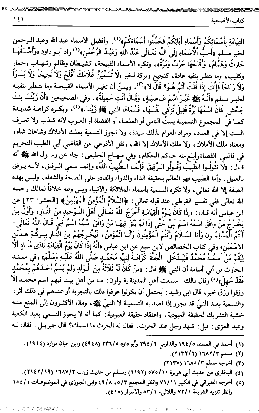 ـــــــــــــــــــــــــــــQ «إنَّكُمْ تُدْعَوْنَ يَوْمَ الْقِيَامَةِ بِأَسْمَائِكُمْ وَأَسْمَاءِ آبَائِكُمْ فَحَسِّنُوا أَسْمَاءَكُمْ» . وَأَفْضَلُ الْأَسْمَاءِ عَبْدُ اللَّهِ وَعَبْدُ الرَّحْمَنِ لِخَبَرِ مُسْلِمٍ «أَحَبُّ الْأَسْمَاءِ إلَى اللَّهِ تَعَالَى عَبْدُ اللَّهِ وَعَبْدُ الرَّحْمَنِ زَادَ أَبُو دَاوُد وَأَصْدَقُهَا حَارِثٌ وَهَمَّامٌ، وَأَقْبَحُهَا حَرْبٌ وَمُرَّةُ» وَتُكْرَهُ الْأَسْمَاءُ الْقَبِيحَةُ، كَشَيْطَانٍ وَظَالِمٍ وَشِهَابٍ وَحِمَارٍ وَكُلَيْبٍ، وَمَا يُتَطَيَّرُ بِنَفْيِهِ عَادَةً، كَنَجِيحٍ وَبَرَكَةَ لِخَبَرِ «لَا تُسَمِّيَنَّ غُلَامَك أَفْلَحَ وَلَا نَجِيحًا وَلَا يَسَارًا وَلَا رَبَاحًا فَإِنَّك إذَا قُلْت أَثَمَّ هُوَ؟ قَالَ لَا» ، وَيُسَنُّ أَنْ تُغَيَّرَ الْأَسْمَاءُ الْقَبِيحَةُ وَمَا يُتَطَيَّرُ بِنَفْيِهِ لِخَبَرِ مُسْلِمٍ «أَنَّهُ - صَلَّى اللَّهُ عَلَيْهِ وَسَلَّمَ - غَيَّرَ اسْمَ عَاصِيَةَ، وَقَالَ أَنْتِ جَمِيلَةٌ» .