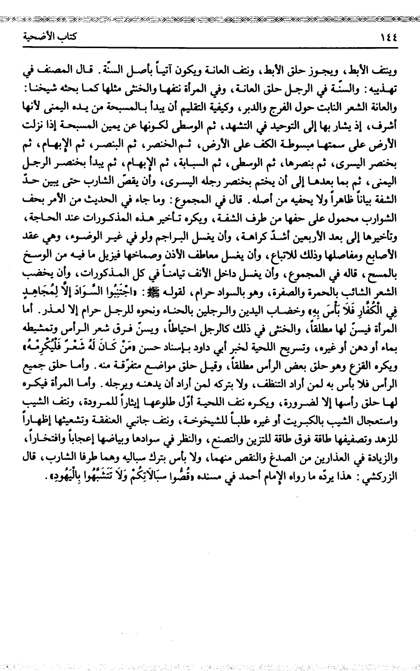 ـــــــــــــــــــــــــــــQوَيَنْتِفَ الْإِبِطَ، وَيَجُوزُ حَلْقُ الْإِبِطِ، وَنَتْفُ الْعَانَةِ وَيَكُونُ آتِيًا بِأَصْلِ السُّنَّةِ قَالَ الْمُصَنِّفُ فِي تَهْذِيبِهِ وَالسُّنَّةُ فِي الرَّجُلِ حَلْقُ الْعَانَةِ، وَفِي الْمَرْأَةِ نَتْفُهَا وَالْخُنْثَى مِثْلُهَا كَمَا بَحَثَهُ شَيْخُنَا وَالْعَانَةُ الشَّعْرُ النَّابِتُ حَوْلَ الْفَرْجِ وَالدُّبُرِ، وَكَيْفِيَّةُ التَّقْلِيمِ أَنْ يَبْدَأَ بِالْمُسَبِّحَةِ مِنْ يَدِهِ الْيُمْنَى لِأَنَّهَا أَشْرَفُ، إذْ يُشَارُ بِهَا إلَى التَّوْحِيدِ فِي التَّشَهُّدِ، ثُمَّ الْوُسْطَى لِكَوْنِهَا عَنْ يَمِينِ الْمُسَبِّحَةِ إذَا نَزَلَتْ الْأَرْضَ عَلَى سِمَتِهَا مَبْسُوطَةَ الْكَفِّ عَلَى الْأَرْضِ، ثُمَّ الْخِنْصَرِ، ثُمَّ الْبِنْصِرِ، ثُمَّ الْإِبْهَامِ، ثُمَّ بِخِنْصَرِ الْيُسْرَى، ثُمَّ بِنْصِرِهَا، ثُمَّ الْوُسْطَى، ثُمَّ السَّبَّابَةِ، ثُمَّ الْإِبْهَامِ، ثُمَّ يَبْدَأُ بِخِنْصَرِ الرِّجْلِ الْيُمْنَى، ثُمَّ بِمَا بَعْدَهَا إلَى أَنْ يَخْتِمَ بِخِنْصَرِ رِجْلِهِ الْيُسْرَى، وَأَنْ يَقُصَّ الشَّارِبَ حَتَّى يُبَيِّنَ حَدَّ الشَّفَةِ بَيَانًا ظَاهِرًا وَلَا يُحْفِيهِ مِنْ أَصْلِهِ قَالَ فِي الْمَجْمُوعِ وَمَا جَاءَ فِي الْحَدِيثِ مِنْ الْأَمْرِ بِحَفِّ الشَّوَارِبِ مَحْمُولٌ عَلَى حَفِّهَا مِنْ طَرَفِ الشَّفَةِ، وَيُكْرَهُ تَأْخِيرُ هَذِهِ الْمَذْكُورَاتِ عِنْدَ الْحَاجَةِ، وَتَأْخِيرُهَا إلَى بَعْدِ الْأَرْبَعِينَ أَشَدُّ كَرَاهَةً، وَأَنْ يَغْسِلَ الْبَرَاجِمَ وَلَوْ فِي غَيْرِ الْوُضُوءِ، وَهِيَ عُقَدُ الْأَصَابِعِ وَمَفَاصِلُهَا وَذَلِكَ لِلِاتِّبَاعِ، وَأَنْ يَغْسِلَ مَعَاطِفَ الْأُذُنِ وَصِمَاخَهَا فَيُزِيلَ مَا فِيهِ مِنْ الْوَسَخِ بِالْمَسْحِ، قَالَهُ فِي الْمَجْمُوعِ، وَأَنْ يَغْسِلَ دَاخِلَ الْأَنْفِ تَيَامُنًا فِي كُلِّ الْمَذْكُورَاتِ، وَأَنْ يُخَضِّبَ الشَّعْرَ الشَّائِبَ بِالْحُمْرَةِ وَالصُّفْرَةِ، وَهُوَ بِالسَّوَادِ حَرَامٌ، لِقَوْلِهِ - صَلَّى اللَّهُ عَلَيْهِ وَسَلَّمَ -: «اجْتَنِبُوا السَّوَادَ إلَّا لِمُجَاهِدٍ فِي الْكُفَّارِ فَلَا بَأْسَ بِهِ» وَخِضَابُ الْيَدَيْنِ وَالرِّجْلَيْنِ بِالْحِنَّاءِ وَنَحْوِهِ لِلرَّجُلِ حَرَامٌ إلَّا لِعُذْرٍ أَمَّا الْمَرْأَةُ فَيُسَنُّ لَهَا مُطْلَقًا، وَالْخُنْثَى فِي ذَلِكَ كَالرَّجُلِ احْتِيَاطًا، وَيُسَنُّ فَرْقُ شَعْرِ الرَّأْسِ وَتَمْشِيطُهُ بِمَاءٍ أَوْ دُهْنٍ أَوْ غَيْرِهِ، وَتَسْرِيحُ اللِّحْيَةِ لِخَبَرِ أَبِي دَاوُد بِإِسْنَادٍ حَسَنٍ «مَنْ كَانَ لَهُ شَعْرٌ فَلْيُكْرِمْهُ» وَيُكْرَهُ الْقَزَعُ وَهُوَ حَلْقُ بَعْضِ الرَّأْسِ مُطْلَقًا، وَقِيلَ حَلْقُ مَوَاضِعَ مُتَفَرِّقَةٍ مِنْهُ. وَأَمَّا حَلْقُ جَمِيعِ الرَّأْسِ فَلَا بَأْسَ بِهِ لِمَنْ أَرَادَ التَّنَظُّفَ، وَلَا بِتَرْكِهِ لِمَنْ أَرَادَ أَنْ يَدْهُنَهُ وَيُرَجِّلَهُ وَأَمَّا الْمَرْأَةُ فَيُكْرَهُ لَهَا حَلْقُ رَأْسِهَا إلَّا لِضَرُورَةٍ، وَيُكْرَهُ نَتْفُ اللِّحْيَةِ أَوَّلَ طُلُوعِهَا إيثَارًا لِلْمُرُودَةِ، وَنَتْفُ الشَّيْبِ وَاسْتِعْجَالُ الشَّيْبِ بِالْكِبْرِيتِ أَوْ غَيْرِهِ طَلَبًا لِلشَّيْخُوخَةِ، وَنَتْفُ جَانِبَيْ الْعَنْفَقَةِ وَتَشْعِيثُهَا إظْهَارًا لِلزُّهْدِ وَتَصْفِيفُهَا طَاقَةً فَوْقَ طَاقَةٍ لِلتَّزَيُّنِ وَالتَّصَنُّعِ، وَالنَّظَرُ فِي سَوَادِهَا وَبَيَاضِهَا إعْجَابًا وَافْتِخَارًا، وَالزِّيَادَةُ فِي الْعِذَارَيْنِ مِنْ الصُّدْغِ. وَالنَّقْصُ مِنْهُمَا، وَلَا بَأْسَ بِتَرْكِ سِبَالَيْهِ وَهُمَا طَرَفَا الشَّارِبِ، قَالَ الزَّرْكَشِيُّ هَذَا يَرُدُّهُ مَا رَوَاهُ الْإِمَامُ أَحْمَدُ فِي مُسْنَدِهِ «قُصُّوا سِبَالَكُمْ وَلَا تَت