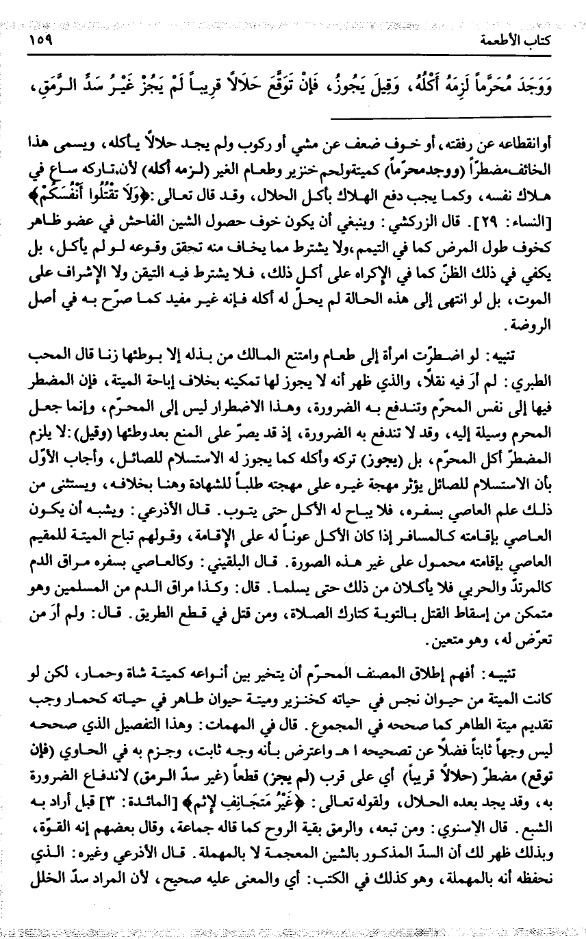 ـــــــــــــــــــــــــــــQأَوْ انْقِطَاعَهُ عَنْ رُفْقَتِهِ، أَوْ خَوْفَ ضَعْفٍ عَنْ مَشْيٍ أَوْ رُكُوبٍ وَلَمْ يَجِدْ حَلَالًا يَأْكُلُهُ، وَيُسَمَّى هَذَا الْخَائِفُ مُضْطَرًّا (وَوَجَدَ مُحَرَّمًا) كَمَيْتَةٍ وَلَحْمِ خِنْزِيرٍ وَطَعَامِ الْغَيْرِ (لَزِمَهُ أَكْلُهُ) لِأَنَّ تَارِكَهُ سَاعٍ فِي هَلَاكِ نَفْسِهِ، وَكَمَا يَجِبُ دَفْعُ الْهَلَاكِ بِأَكْلِ الْحَلَالِ، وَقَدْ قَالَ تَعَالَى {وَلا تَقْتُلُوا أَنْفُسَكُمْ} [النساء: 29] قَالَ الزَّرْكَشِيُّ وَيَنْبَغِي أَنْ يَكُونَ خَوْفُ حُصُولِ الشَّيْنِ الْفَاحِشِ فِي عُضْوٍ ظَاهِرٍ كَخَوْفِ طُولِ الْمَرَضِ كَمَا فِي التَّيَمُّمِ، وَلَا يُشْتَرَطُ مِمَّا يُخَافُ مِنْهُ تَحَقُّقُ وُقُوعِهِ لَوْ لَمْ يَأْكُلْ، بَلْ يَكْفِي فِي ذَلِكَ الظَّنُّ كَمَا فِي الْإِكْرَاهِ عَلَى أَكْلِ ذَلِكَ، فَلَا يُشْتَرَطُ فِيهِ التَّيَقُّنُ وَلَا الْإِشْرَافُ عَلَى الْمَوْتِ، بَلْ لَوْ انْتَهَى إلَى هَذِهِ الْحَالَةِ لَمْ يَحِلَّ لَهُ أَكْلُهُ فَإِنَّهُ غَيْرُ مُفِيدٍ كَمَا صَرَّحَ بِهِ فِي أَصْلِ الرَّوْضَةِ.