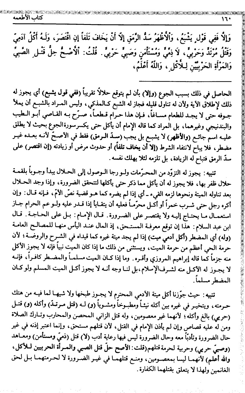 (وَ) لَهُ (قَتْلُ مُرْتَدٍّ) وَأَكْلُهُ (وَ) قَتْلُ (حَرْبِيٍّ) بَالِغٍ وَأَكْلُهُ؛ لِأَنَّهُمَا غَيْرُ مَعْصُومَيْنِ، وَلَهُ قَتْلُ الزَّانِي الْمُحْصَنِ وَالْمُحَارِبِ وَتَارِكِ الصَّلَاةِ وَمَنْ لَهُ عَلَيْهِ قِصَاصٌ وَإِنْ لَمْ يَأْذَنْ الْإِمَامُ فِي الْقَتْلِ، لِأَنَّ قَتْلَهُمْ مُسْتَحَقٌّ، وَإِنَّمَا اُعْتُبِرَ إذْنُهُ فِي غَيْرِ حَالِ الضَّرُورَةِ وَتَأَدُّبًا مَعَهُ وَحَالُ الضَّرُورَةِ لَيْسَ فِيهَا رِعَايَةُ أَدَبٍ (لَا) قَتْلُ (ذِمِّيٍّ وَمُسْتَأْمَنٍ) وَمُعَاهَدٍ (وَصَبِيٍّ حَرْبِيٍّ) وَحَرْبِيَّةٍ لِحُرْمَةِ قَتْلِهِمْ (قُلْت الْأَصَحُّ حِلُّ قَتْلِ الصَّبِيِّ وَالْمَرْأَةِ الْحَرْبِيَّيْنِ لِلْأَكْلِ، وَاَللَّهُ أَعْلَمُ) لِأَنَّهُمَا لَيْسَا بِمَعْصُومَيْنِ، وَمَنْعُ قَتْلِهِمَا فِي غَيْرِ الضَّرُورَةِ لَا لِحُرْمَتِهِمَا بَلْ لِحَقِّ الْغَانِمِينَ وَلِهَذَا لَا يَتَعَلَّقُ بِقَتْلِهِمَا الْكَفَّارَةُ