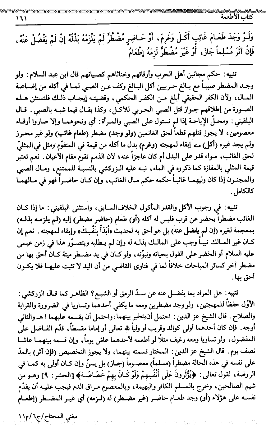 تَنْبِيهٌ: فِي وُجُوبِ الْأَكْلِ وَالْقَدْرِ الْمَأْكُولِ الْخِلَافُ السَّابِقُ، وَاسْتَثْنَى الْبُلْقِينِيُّ مَا إذَا كَانَ الْغَائِبُ مُضْطَرًّا يَحْضُرُ عَنْ قُرْبٍ فَلَيْسَ لَهُ أَكْلُهُ (أَوْ) طَعَامَ (حَاضِرٍ مُضْطَرٍّ) إلَيْهِ (لَمْ يَلْزَمْهُ بَذْلُهُ) - بِمُعْجَمَةٍ - لِغَيْرِهِ (إنْ لَمْ يَفْضُلْ عَنْهُ) بَلْ هُوَ أَحَقُّ بِهِ لِحَدِيثِ «ابْدَأْ بِنَفْسِك» وَإِبْقَاءً لِمُهْجَتِهِ. نَعَمْ إنْ كَانَ غَيْرُ الْمَالِكِ نَبِيًّا وَجَبَ عَلَى الْمَالِكِ بَذْلُهُ لَهُ وَإِنْ لَمْ يَطْلُبْهُ وَيُتَصَوَّرُ هَذَا فِي زَمَنِ عِيسَى - عَلَيْهِ السَّلَامُ - أَوْ الْخِضْرِ عَلَى الْقَوْلِ بِحَيَاتِهِ وَنُبُوَّتِهِ، وَلَوْ كَانَ فِي يَدِ مُضْطَرٍّ مَيْتَةٌ كَانَ أَحَقَّ بِهَا مِنْ مُضْطَرٍّ آخَرَ كَسَائِرِ الْمُبَاحَاتِ خِلَافًا لِمَا فِي فَتَاوَى الْقَاضِي مِنْ أَنَّ الْيَدَ لَا تَثْبُتُ عَلَيْهَا فَلَا يَكُونُ أَحَقَّ بِهَا