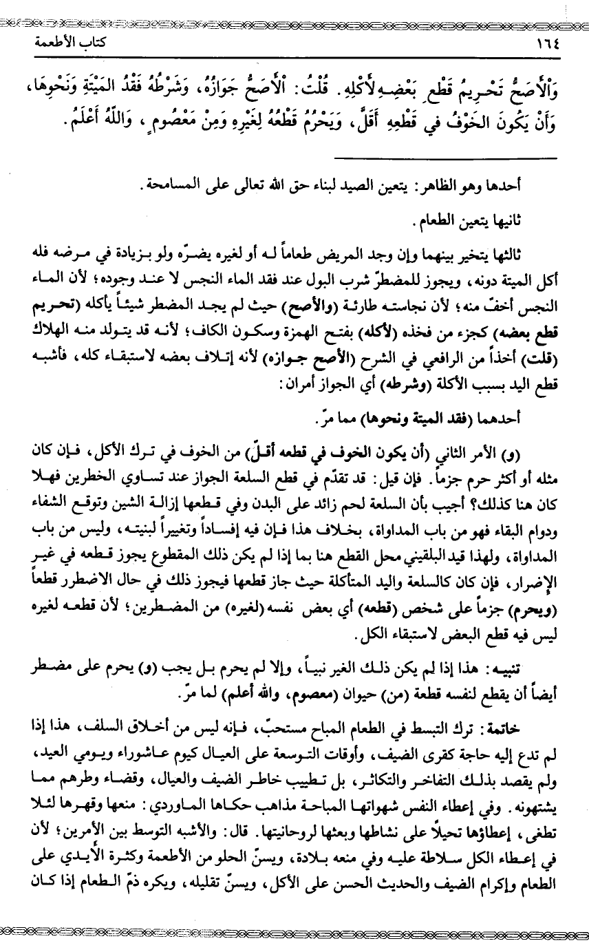 وَالْأَصَحُّ تَحْرِيمُ قَطْعِ بَعْضِهِ لِأَكْلِهِ. قُلْت: الْأَصَحُّ جَوَازُهُ، وَشَرْطُهُ فَقْدُ الْمَيْتَةِ وَنَحْوِهَا، وَأَنْ يَكُونَ الْخَوْفُ فِي قَطْعِهِ أَقَلَّ، وَيَحْرُمُ قَطْعُهُ لِغَيْرِهِ وَمِنْ مَعْصُومٍ، وَاَللَّهُ أَعْلَمُ.