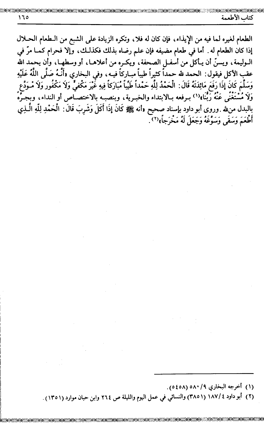 ـــــــــــــــــــــــــــــQالطَّعَامُ لِغَيْرِهِ لِمَا فِيهِ مِنْ الْإِيذَاءِ، فَإِنْ كَانَ لَهُ فَلَا، وَتُكْرَهُ الزِّيَادَةُ عَلَى الشِّبَعِ مِنْ الطَّعَامِ الْحَلَالِ إذَا كَانَ الطَّعَامُ لَهُ أَمَّا فِي طَعَامِ مَضِيفِهِ فَإِنْ عَلِمَ رِضَاهُ بِذَلِكَ فَكَذَلِكَ، وَإِلَّا فَحَرَامٌ كَمَا مَرَّ فِي الْوَلِيمَةِ، وَيُسَنُّ أَنْ يَأْكُلَ مِنْ أَسْفَلِ الصَّحْفَةِ، وَيُكْرَهُ مِنْ أَعْلَاهَا، أَوْ وَسَطِهَا، وَأَنْ يَحْمَدَ اللَّهَ عَقِبَ الْأَكْلِ فَيَقُولَ الْحَمْدُ لِلَّهِ حَمْدًا كَثِيرًا طَيِّبًا مُبَارَكًا فِيهِ، وَفِي الْبُخَارِيِّ «أَنَّهُ - صَلَّى اللَّهُ عَلَيْهِ وَسَلَّمَ - كَانَ إذَا رَفَعَ مَائِدَتَهُ قَالَ الْحَمْدُ لِلَّهِ حَمْدًا طَيِّبًا مُبَارَكًا فِيهِ غَيْرَ مَكْفِيٍّ وَلَا مَكْفُورٍ وَلَا مُوَدَّعٍ وَلَا مُسْتَغْنًى عَنْهُ رَبُّنَا» بِرَفْعِهِ بِالِابْتِدَاءِ وَالْخَبَرِيَّةِ، وَبِنَصْبِهِ بِالِاخْتِصَاصِ أَوْ النِّدَاءِ، وَبِجَرِّهِ بِالْبَدَلِ مِنْ لِلَّهِ وَرَوَى أَبُو دَاوُد بِإِسْنَادٍ صَحِيحٍ «أَنَّهُ - صَلَّى اللَّهُ عَلَيْهِ وَسَلَّمَ - كَانَ إذَا أَكَلَ وَشَرِبَ قَالَ الْحَمْدُ لِلَّهِ الَّذِي أَطْعَمَ وَسَقَى وَسَوَّغَهُ وَجَعَلَ لَهُ مَخْرَجًا» .