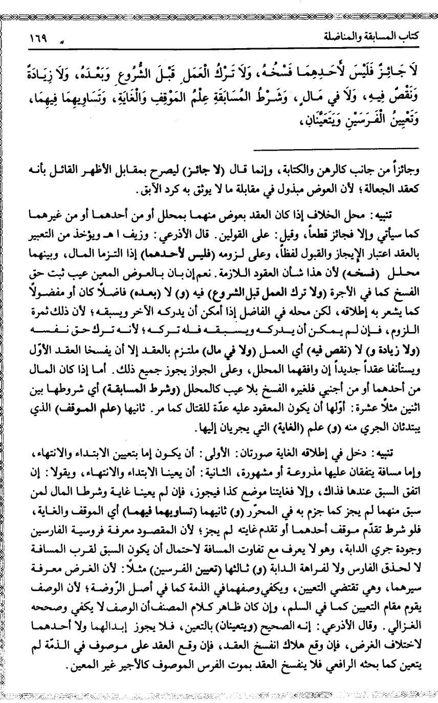 وَيُؤْخَذُ مِنْ التَّعْبِيرِ بِالْعَقْدِ اعْتِبَارُ الْإِيجَازِ وَالْقَبُولِ لَفْظًا، وَعَلَى لُزُومِهِ (فَلَيْسَ لِأَحَدِهِمَا) إذَا الْتَزَمَا الْمَالَ، وَبَيْنَهُمَا مُحَلِّلٌ (فَسْخُهُ) لِأَنَّ هَذَا شَأْنُ الْعُقُودِ اللَّازِمَةِ نَعَمْ إنْ بَانَ بِالْعِوَضِ الْمُعَيَّنِ عَيْبٌ ثَبَتَ حَقُّ الْفَسْخِ كَمَا فِي الْأُجْرَةِ (وَلَا تَرْكُ الْعَمَلِ قَبْلَ الشُّرُوعِ) فِيهِ (وَ) لَا (بَعْدَهُ) فَاضِلًا كَانَ أَوْ مَفْضُولًا كَمَا يُشْعِرُ بِهِ إطْلَاقُهُ، لَكِنَّ مَحِلَّهُ فِي الْفَاضِلِ إذَا أَمْكَنَ أَنْ يُدْرِكَهُ الْآخَرُ وَيَسْبِقَهُ؛ لِأَنَّ ذَلِكَ ثَمَرَةُ اللُّزُومِ، فَإِنْ لَمْ يُمْكِنْ أَنْ يُدْرِكَهُ وَيَسْبِقَهُ فَلَهُ تَرْكُهُ؛ لِأَنَّهُ تَرَكَ حَقَّ نَفْسِهِ (وَلَا زِيَادَةٌ وَ) لَا (نَقْصٌ فِيهِ) أَيْ الْعَمَلِ (وَلَا فِي مَالٍ) مُلْتَزَمٍ بِالْعَقْدِ إلَّا أَنْ يَفْسَخَا الْعَقْدَ الْأَوَّلَ وَيَسْتَأْنِفَا عَقْدًا جَدِيدًا إنْ وَافَقَهُمَا الْمُحَلِّلُ، وَعَلَى الْجَوَازِ يَجُوزُ جَمِيعُ ذَلِكَ أَمَّا إذَا كَانَ الْمَالُ مِنْ أَحَدِهِمَا أَوْ مِنْ أَجْنَبِيٍّ فَلِغَيْرِهِ الْفَسْخُ بِلَا عَيْبٍ كَالْمُحَلِّلِ.