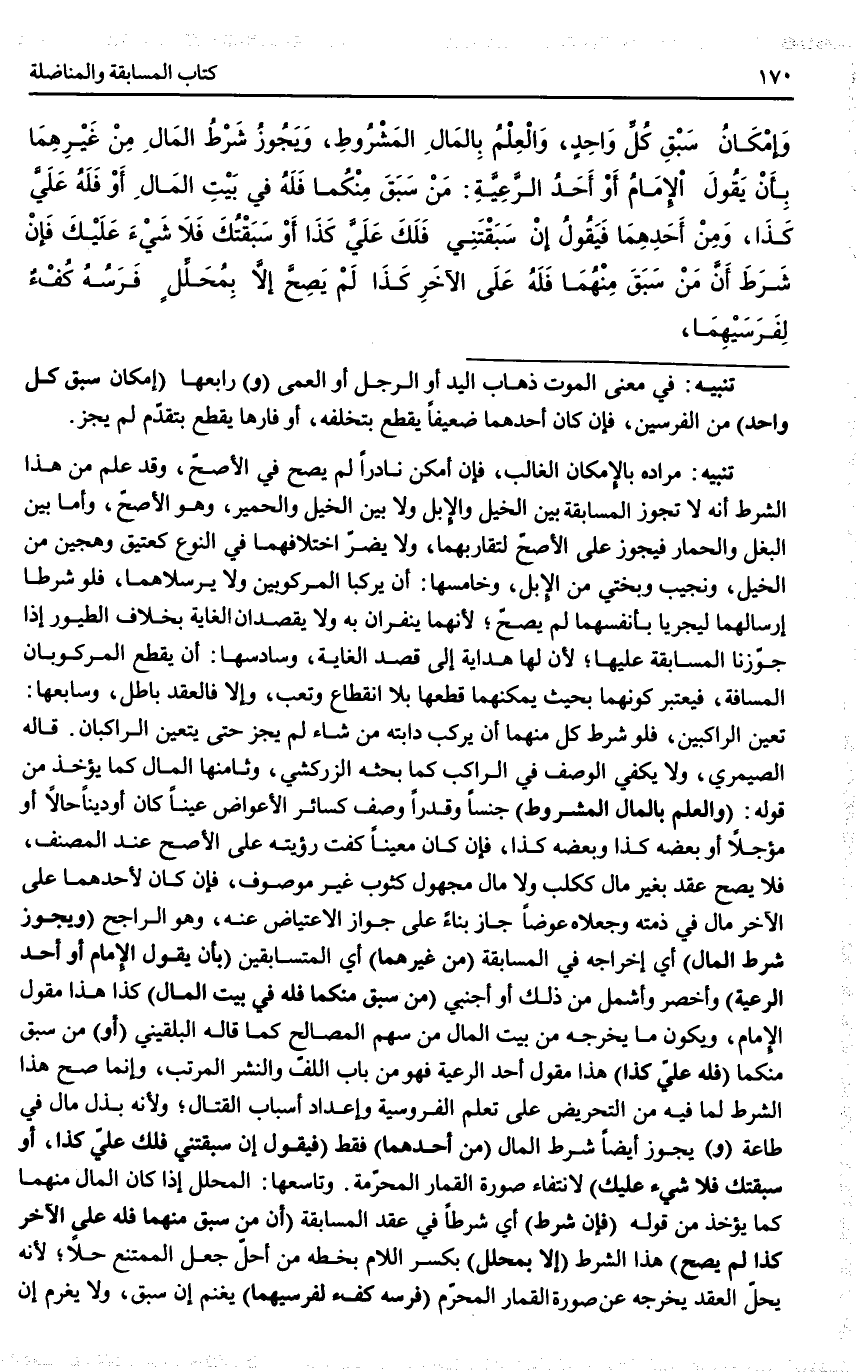 تَنْبِيهٌ: مُرَادُهُ بِالْإِمْكَانِ الْغَالِبُ، فَإِنْ أَمْكَنَ نَادِرًا لَمْ يَصِحَّ فِي الْأَصَحِّ، وَقَدْ عُلِمَ مِنْ هَذَا الشَّرْطِ أَنَّهُ لَا تَجُوزُ الْمُسَابَقَةُ بَيْنَ الْخَيْلِ وَالْإِبِلِ وَلَا بَيْنَ الْخَيْلِ وَالْحَمِيرِ، وَهُوَ الْأَصَحُّ، وَأَمَّا بَيْنَ الْبَغْلِ وَالْحِمَارِ فَيَجُوزُ عَلَى الْأَصَحِّ لِتَقَارُبِهِمَا، وَلَا يَضُرُّ اخْتِلَافُهُمَا فِي النَّوْعِ كَعَتِيقٍ وَهَجِينٍ مِنْ الْخَيْلِ، وَنَجِيبٍ وَبُخْتِيٍّ مِنْ الْإِبِلِ، وَخَامِسُهَا أَنْ يَرْكَبَا الْمَرْكُوبَيْنِ وَلَا يُرْسِلَاهُمَا، فَلَوْ شَرَطَا إرْسَالَهُمَا لِيَجْرِيَا بِأَنْفُسِهِمَا لَمْ يَصِحَّ؛ لِأَنَّهُمَا يَنْفِرَانِ بِهِ وَلَا يَقْصِدَانِ الْغَايَةَ بِخِلَافِ الطُّيُورِ إذَا جَوَّزْنَا الْمُسَابَقَةَ عَلَيْهَا؛ لِأَنَّ لَهَا هِدَايَةً إلَى قَصْدِ الْغَايَةِ، وَسَادِسُهَا أَنْ يَقْطَعَ الْمَرْكُوبَانِ الْمَسَافَةَ، فَيُعْتَبَرُ كَوْنُهُمَا بِحَيْثُ يُمْكِنُهُمَا قَطْعُهَا بِلَا انْقِطَاعٍ وَتَعَبٍ، وَإِلَّا فَالْعَقْدُ بَاطِلٌ، وَسَابِعُهَا تَعَيُّنُ الرَّاكِبَيْنِ، فَلَوْ شَرَطَ كُلٌّ مِنْهُمَا أَنْ يُرْكِبَ دَابَّتَهُ مَنْ شَاءَ لَمْ يَجُزْ حَتَّى يَتَعَيَّنَ الرَّاكِبَانِ قَالَهُ الصَّيْمَرِيُّ، وَلَا يَكْفِي الْوَصْفُ فِي الرَّاكِبِ كَمَا بَحَثَهُ الزَّرْكَشِيُّ، وَثَامِنُهَا الْمَالُ كَمَا يُؤْخَذُ مِنْ قَوْلِهِ (وَالْعِلْمُ بِالْمَالِ الْمَشْرُوطِ) جِنْسًا وَقَدْرًا وَصِفَةً كَسَائِرِ الْأَعْوَاضِ عَيْنًا كَانَ أَوْ دَيْنًا حَالًّا أَوْ مُؤَجَّلًا أَوْ بَعْضُهُ كَذَا وَبَعْضُهُ كَذَا، فَإِنْ كَانَ مُعَيَّنًا كَفَتْ رُؤْيَتُهُ عَلَى الْأَصَحِّ عِنْدَ الْمُصَنِّفِ، فَلَا يَصِحُّ عَقْدٌ بِغَيْرِ مَالٍ كَكَلْبٍ، وَلَا مَالٌ مَجْهُولٌ كَثَوْبٍ غَيْرِ مَوْصُوفٍ، فَإِنْ كَانَ لِأَحَدِهِمَا عَلَى الْآخَرِ مَالٌ فِي ذِمَّتِهِ وَجَعَلَاهُ عِوَضًا جَازَ بِنَاءً عَلَى جَوَازِ الِاعْتِيَاضِ عَنْهُ، وَهُوَ الرَّاجِحُ.