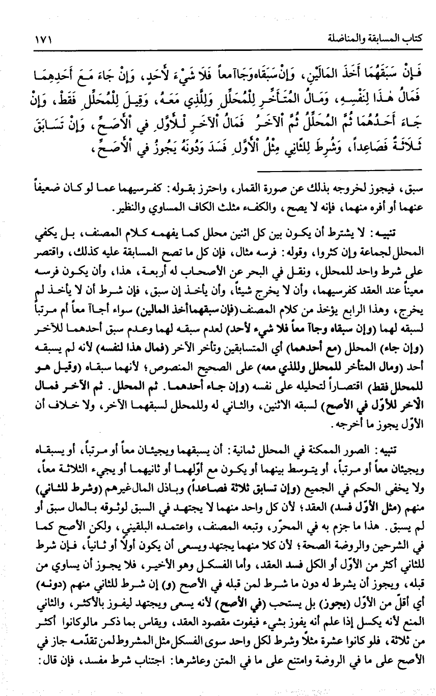 (وَإِنْ تَسَابَقَ ثَلَاثَةٌ فَصَاعِدًا) وَبَاذِلُ الْمَالِ غَيْرُهُمْ (وَشُرِطَ لِلثَّانِي) مِنْهُمْ (مِثْلُ الْأَوَّلِ فَسَدَ) الْعَقْدُ؛ لِأَنَّ كُلَّ وَاحِدٍ مِنْهُمَا لَا يَجْتَهِدُ فِي السَّبْقِ لِوُثُوقِهِ بِالْمَالِ سَبَقَ أَوْ لَمْ يَسْبِقْ هَذَا مَا جَزَمَ بِهِ فِي الْمُحَرَّرِ، وَتَبِعَهُ الْمُصَنِّفُ، وَاعْتَمَدَهُ الْبُلْقِينِيُّ، وَلَكِنَّ الْأَصَحَّ كَمَا فِي الشَّرْحَيْنِ وَالرَّوْضَةِ الصِّحَّةُ؛ لِأَنَّ كُلًّا مِنْهُمَا يَجْتَهِدُ وَيَسْعَى أَنْ يَكُونَ أَوَّلًا أَوْ ثَانِيًا، فَإِنْ شُرِطَ لِلثَّانِي أَكْثَرُ مِنْ الْأَوَّلِ، أَوْ الْكُلُّ فَسَدَ الْعَقْدُ، وَأَمَّا الْفِسْكِلُ وَهُوَ الْأَخِيرُ، فَلَا يَجُوزُ أَنْ يُسَاوِيَ مَنْ قَبْلَهُ، وَيَجُوزُ أَنْ يُشْرَطَ لَهُ دُونَ مَا شُرِطَ لِمَنْ قَبْلَهُ فِي الْأَصَحِّ (وَ) إنْ شُرِطَ لِلثَّانِي مِنْهُمْ (دُونَهُ) أَيْ أَقَلُّ مِنْ الْأَوَّلِ (يَجُوزُ) بَلْ يُسْتَحَبُّ (فِي الْأَصَحِّ) لِأَنَّهُ يَسْعَى وَيَجْتَهِدُ لِيَفُوزَ بِالْأَكْثَرِ، وَالثَّانِي الْمَنْعُ لِأَنَّهُ يَكْسَلُ إذَا عَلِمَ أَنَّهُ يَفُوزُ بِشَيْءٍ فَيَفُوتُ مَقْصُودُ الْعَقْدِ، وَيُقَاسُ بِمَا ذُكِرَ مَا لَوْ كَانُوا أَكْثَرَ مِنْ ثَلَاثَةٍ، فَلَوْ كَانُوا عَشَرَةً مَثَلًا وَشُرِطَ لِكُلِّ وَاحِدٍ سِوَى الْفِسْكِلِ مِثْلُ الْمَشْرُوطِ لِمَنْ تَقَدَّمَهُ جَازَ فِي الْأَصَحِّ عَلَى مَا فِي الرَّوْضَةِ وَامْتَنَعَ عَلَى مَا فِي الْمَتْنِ، وَعَاشِرُهَا اجْتِنَابُ شَرْطٍ مُفْسِدٍ، فَإِنْ قَالَ