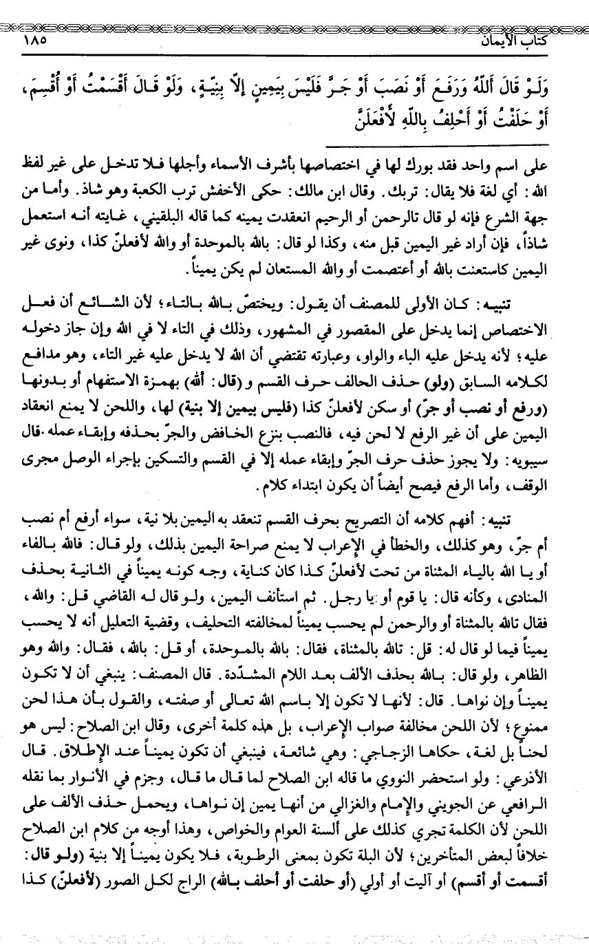 تَنْبِيهٌ أَفْهَمَ كَلَامُهُ أَنَّ التَّصْرِيحَ بِحَرْفِ الْقَسَمِ تَنْعَقِدُ بِهِ الْيَمِينُ بِلَا نِيَّةٍ، سَوَاءٌ أَرَفَعَ أَمْ نَصَبَ أَمْ جَرَّ، وَهُوَ كَذَلِكَ، وَالْخَطَأُ فِي الْإِعْرَابِ لَا يَمْنَعُ صَرَاحَةَ الْيَمِينِ بِذَلِكَ، وَلَوْ قَالَ: فَاَللَّهِ بِالْفَاءِ أَوْ يَا اللَّهِ بِالْيَاءِ الْمُثَنَّاةِ مِنْ تَحْتُ لَأَفْعَلَنَّ كَذَا كَانَ كِنَايَةً، وَجْهُ كَوْنِهِ يَمِينًا فِي الثَّانِيَةِ بِحَذْفِ الْمُنَادَى، وَكَأَنَّهُ قَالَ: يَا قَوْمُ أَوْ يَا رَجُلُ. ثُمَّ اسْتَأْنَفَ الْيَمِينَ، وَلَوْ قَالَ لَهُ الْقَاضِي قُلْ: وَاَللَّهِ، فَقَالَ تَاللَّهِ بِالْمُثَنَّاةِ أَوْ وَالرَّحْمَنِ لَمْ يُحْسَبْ يَمِينًا لِمُخَالَفَتِهِ التَّحْلِيفَ، وَقَضِيَّةُ التَّعْلِيلِ أَنَّهُ لَا يُحْسَبُ يَمِينًا فِيمَا لَوْ قَالَ لَهُ: قُلْ: تَاللَّهِ بِالْمُثَنَّاةِ، فَقَالَ: بِاَللَّهِ بِالْمُوَحَّدَةِ، أَوْ قُلْ: بِاَللَّهِ، فَقَالَ: وَاَللَّهِ وَهُوَ الظَّاهِرُ، وَلَوْ قَالَ: بِاَللَّهِ بِحَذْفِ الْأَلِفِ بَعْدَ اللَّامِ الْمُشَدَّدَةِ. قَالَ الْمُصَنِّفُ: يَنْبَغِي أَنْ لَا تَكُونَ يَمِينًا وَإِنْ نَوَاهَا. قَالَ: لِأَنَّهَا لَا تَكُونُ إلَّا بِاسْمِ اللَّهِ تَعَالَى أَوْ صِفَتِهِ، وَالْقَوْلُ بِأَنَّ هَذَا لَحْنٌ مَمْنُوعٌ؛ لِأَنَّ اللَّحْنَ مُخَالَفَةُ صَوَابِ الْإِعْرَابِ، بَلْ هَذِهِ كَلِمَةٌ أُخْرَى، وَقَالَ ابْنُ الصَّلَاحِ: لَيْسَ هُوَ لَحْنًا بَلْ لُغَةً، حَكَاهَا الزَّجَّاجِيُّ: وَهِيَ شَائِعَةٌ، فَيَنْبَغِي أَنْ تَكُونَ يَمِينًا عِنْدَ الْإِطْلَاقِ. قَالَ الْأَذْرَعِيُّ: وَلَوْ اسْتَحْضَرَ النَّوَوِيُّ مَا قَالَهُ ابْنُ الصَّلَاحِ لَمَا قَالَ مَا قَالَ، وَجَزَمَ فِي الْأَنْوَارِ بِمَا نَقَلَهُ الرَّافِعِيُّ عَنْ الْجُوَيْنِيِّ وَالْإِمَامِ وَالْغَزَالِيِّ مِنْ أَنَّهَا يَمِينٌ إنْ نَوَاهَا، وَيُحْمَلُ حَذْفُ الْأَلْفِ عَلَى اللَّحْنِ؛ لِأَنَّ الْكَلِمَةَ تَجْرِي كَذَلِكَ عَلَى أَلْسِنَةِ الْعَوَامّ وَالْخَوَاصِّ، وَهَذَا أَوْجَهُ مِنْ كَلَامِ ابْنِ الصَّلَاحِ خِلَافًا لِبَعْضِ الْمُتَأَخِّرِينَ؛ لِأَنَّ الْبَلَّةَ تَكُونُ بِمَعْنَى الرُّطُوبَةِ، فَلَا يَكُونُ يَمِينًا إلَّا بِنِيَّةٍ.