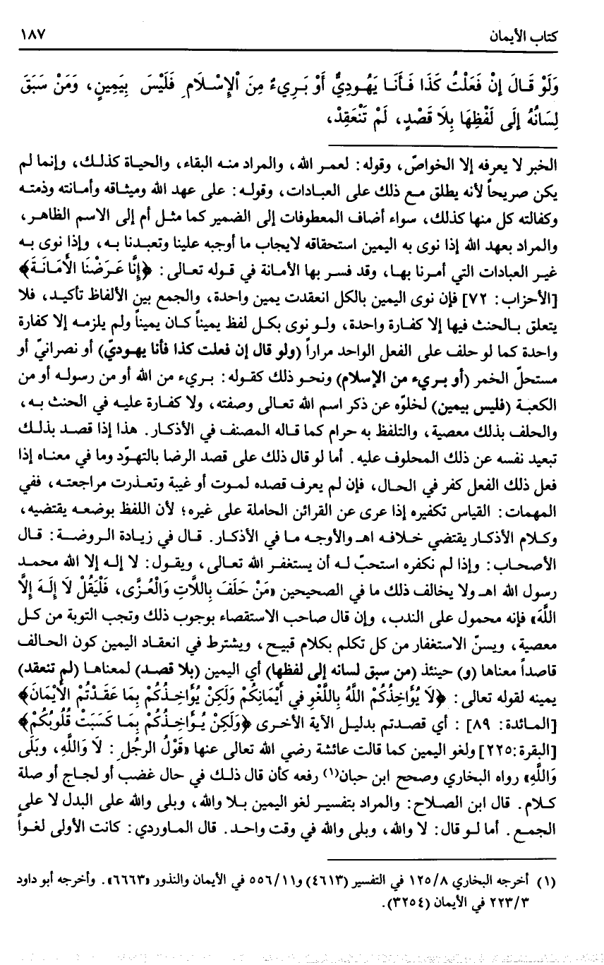 وَيُشْتَرَطُ فِي انْعِقَادِ الْيَمِينِ كَوْنُ الْحَالِفِ قَاصِدًا مَعْنَاهَا (وَ) حِينَئِذٍ (مَنْ سَبَقَ لِسَانُهُ إلَى لَفْظِهَا) أَيْ الْيَمِينِ (بِلَا قَصْدٍ) لِمَعْنَاهَا (لَمْ تَنْعَقِدْ) يَمِينُهُ لِقَوْلِهِ تَعَالَى: {لا يُؤَاخِذُكُمُ اللَّهُ بِاللَّغْوِ فِي أَيْمَانِكُمْ وَلَكِنْ يُؤَاخِذُكُمْ بِمَا عَقَّدْتُمُ الأَيْمَانَ} [المائدة: 89] أَيْ قَصَدْتُمْ بِدَلِيلِ الْآيَةِ الْأُخْرَى {وَلَكِنْ يُؤَاخِذُكُمْ بِمَا كَسَبَتْ قُلُوبُكُمْ} [البقرة: 225] وَلَغْوُ الْيَمِينِ كَمَا قَالَتْ عَائِشَةُ - رَضِيَ اللَّهُ تَعَالَى عَنْهَا - «قَوْلُ الرَّجُلِ: لَا وَاَللَّهِ، وَبَلَى وَاَللَّهِ» رَوَاهُ الْبُخَارِيُّ وَصَحَّحَ ابْنُ حِبَّانَ رَفْعَهُ كَأَنْ قَالَ ذَلِكَ فِي حَالِ غَضَبٍ أَوْ لَجَاجٍ أَوْ صِلَةِ كَلَامٍ. قَالَ ابْنُ الصَّلَاحِ: وَالْمُرَادُ بِتَفْسِيرِ لَغْوِ الْيَمِينِ بِلَا وَاَللَّهِ، وَبَلَى وَاَللَّهِ عَلَى الْبَدَلِ لَا عَلَى الْجَمْعِ أَمَّا لَوْ قَالَ: لَا وَاَللَّهِ، وَبَلَى وَاَللَّهِ فِي وَقْتٍ وَاحِدٍ. قَالَ الْمَاوَرْدِيُّ: كَانَتْ الْأُولَى لَغْوًا