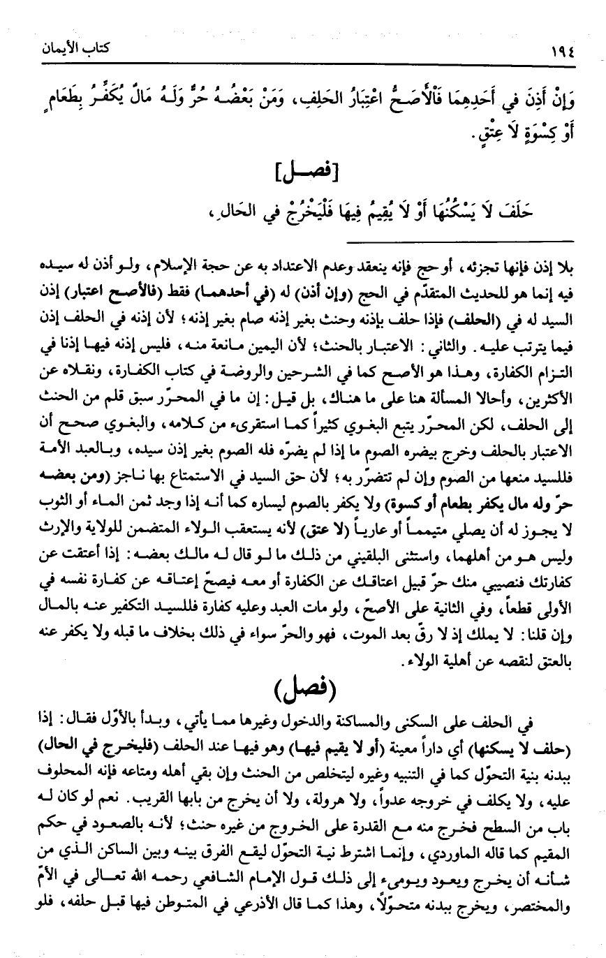 [فَصْلٌ] فِي الْحَلِفِ عَلَى السُّكْنَى وَالْمُسَاكَنَةِ وَالدُّخُولِ وَغَيْرِهَا مِمَّا يَأْتِي، وَبَدَأَ بِالْأَوَّلِ فَقَالَ: إذَا (حَلَفَ لَا يَسْكُنُهَا) أَيْ دَارًا مُعَيَّنَةً (أَوْ لَا يُقِيمُ فِيهَا) وَهُوَ فِيهَا عِنْدَ الْحَلِفِ (فَلْيَخْرُجْ فِي الْحَالِ) بِبَدَنِهِ بِنِيَّةِ التَّحَوُّلِ كَمَا فِي التَّنْبِيهِ وَغَيْرِهِ لِيَتَخَلَّصَ مِنْ الْحِنْثِ وَإِنْ بَقِيَ أَهْلُهُ وَمَتَاعُهُ فَإِنَّهُ الْمَحْلُوفُ عَلَيْهِ، وَلَا يُكَلَّفُ فِي خُرُوجِهِ عَدْوًا، وَلَا هَرْوَلَةً، وَلَا أَنْ يَخْرُجَ مِنْ بَابِهَا الْقَرِيبِ. نَعَمْ لَوْ كَانَ لَهُ بَابٌ مِنْ السَّطْحِ فَخَرَجَ مِنْهُ مَعَ الْقُدْرَةِ عَلَى الْخُرُوجِ مِنْ غَيْرِهِ حَنِثَ؛ لِأَنَّهُ بِالصُّعُودِ فِي حُكْمِ الْمُقِيمِ كَمَا قَالَهُ الْمَاوَرْدِيُّ، وَإِنَّمَا اُشْتُرِطَ نِيَّةُ التَّحَوُّلِ لِيَقَعَ الْفَرْقُ بَيْنَهُ وَبَيْنَ السَّاكِنِ الَّذِي مِنْ شَأْنِهِ أَنْ يَخْرُجَ وَيَعُودَ، وَيُومِئُ إلَى ذَلِكَ قَوْلُ الْإِمَامِ الشَّافِعِيِّ، - رَحِمَهُ اللَّهُ تَعَالَى - فِي الْأُمِّ وَالْمُخْتَصَرِ، وَيَخْرُجُ بِبَدَنِهِ مُتَحَوِّلًا، وَهَذَا كَمَا قَالَ الْأَذْرَعِيُّ فِي الْمُتَوَطِّنِ فِيهَا قَبْلَ حَلِفِهِ، فَلَوْ