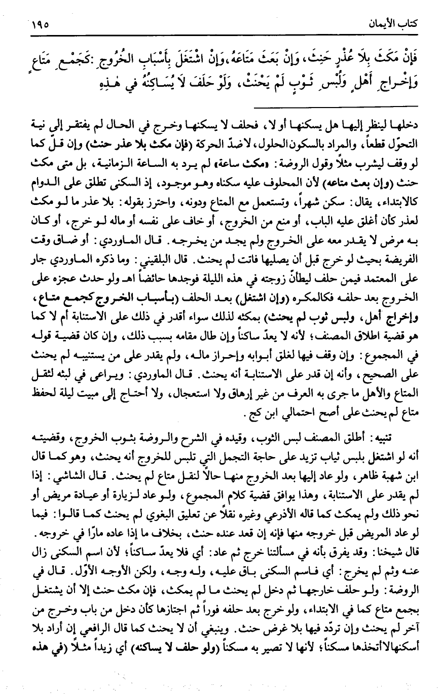 وَقَوْلُ الرَّوْضَةِ: " مَكَثَ سَاعَةً " لَمْ يُرِدْ بِهِ السَّاعَةَ الزَّمَانِيَّةَ، بَلْ مَتَى مَكَثَ حَنِثَ (وَإِنْ بَعَثَ مَتَاعَهُ) لِأَنَّ الْمَحْلُوفَ عَلَيْهِ سُكْنَاهُ وَهُوَ مَوْجُودٌ، إذْ السُّكْنَى تُطْلَقُ عَلَى الدَّوَامِ كَالِابْتِدَاءِ، يُقَالُ: سَكَنَ شَهْرًا، وَتُسْتَعْمَلُ مَعَ الْمَتَاعِ وَدُونَهُ، وَاحْتَرَزَ بِقَوْلِهِ: بِلَا عُذْرٍ مَا لَوْ مَكَثَ لِعُذْرٍ كَأَنْ أُغْلِقَ عَلَيْهِ الْبَابُ، أَوْ مُنِعَ مِنْ الْخُرُوجِ، أَوْ خَافَ عَلَى نَفْسِهِ أَوْ مَالِهِ لَوْ خَرَجَ، أَوْ كَانَ بِهِ مَرَضٌ لَا يَقْدِرُ مَعَهُ عَلَى الْخُرُوجِ وَلَمْ يَجِدْ مَنْ يُخْرِجُهُ. قَالَ الْمَاوَرْدِيُّ: أَوْ ضَاقَ وَقْتُ الْفَرِيضَةِ بِحَيْثُ لَوْ خَرَجَ قَبْلَ أَنْ يُصَلِّيَهَا وَفَاتَتْ لَمْ يَحْنَثْ. قَالَ الْبُلْقِينِيُّ: وَمَا ذَكَرَهُ الْمَاوَرْدِيُّ جَارٍ عَلَى الْمُعْتَمَدِ فِيمَنْ حَلَفَ لَيَطَأَنَّ زَوْجَتَهُ فِي هَذِهِ اللَّيْلَةِ فَوَجَدَهَا حَائِضًا اهـ.
