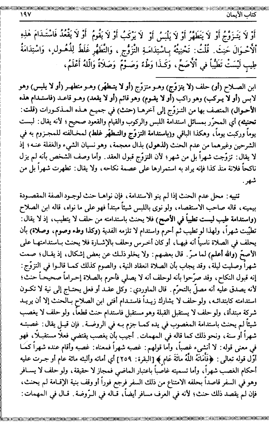 أَوْ لَا يَتَزَوَّجُ أَوْ لَا يَتَطَهَّرُ أَوْ لَا يَلْبَسُ أَوْ لَا يَرْكَبُ أَوْ لَا يَقُومُ أَوْ لَا يَقْعُدُ فَاسْتَدَامَ هَذِهِ الْأَحْوَالَ حَنِثَ. قُلْت: تَحْنِيثُهُ بِاسْتِدَامَةِ التَّزَوُّجِ، وَالتَّطَهُّرِ غَلَطٌ لِذُهُولٍ، وَاسْتِدَامَةُ طِيبٍ لَيْسَتْ تَطَيُّبًا فِي الْأَصَحِّ، وَكَذَا وَطْءٌ وَصَوْمٌ وَصَلَاةٌ وَاَللَّهُ أَعْلَمُ.