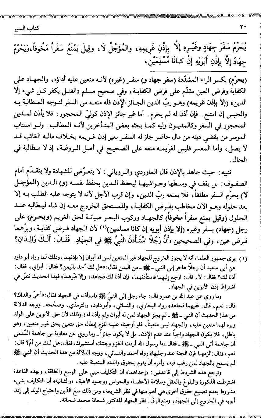 (وَيَحْرُمُ) عَلَى رَجُلٍ (جِهَادٌ) بِسَفَرٍ وَغَيْرِهِ (إلَّا بِإِذْنِ أَبَوَيْهِ إنْ كَانَا مُسْلِمَيْنِ) ؛ لِأَنَّ الْجِهَادَ فَرْضُ كِفَايَةٍ، وَبِرَّهُمَا فَرْضُ عَيْنٍ، وَفِي الصَّحِيحَيْنِ "