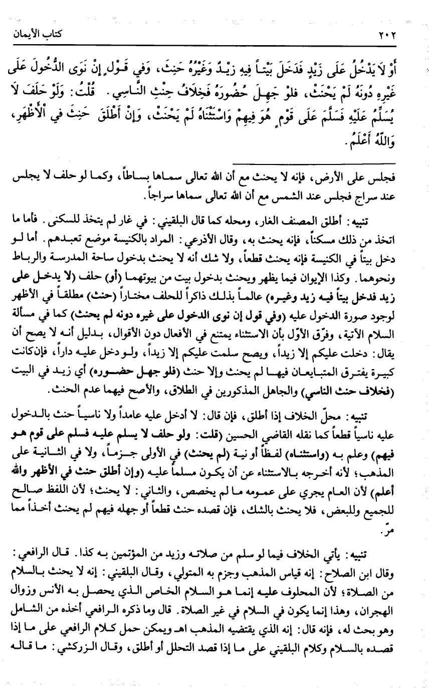 أَوْ لَا يَدْخُلُ عَلَى زَيْدٍ فَدَخَلَ بَيْتًا فِيهِ زَيْدٌ وَغَيْرُهُ حَنِثَ، وَفِي قَوْلٍ إنْ نَوَى الدُّخُولَ عَلَى غَيْرِهِ دُونَهُ لَمْ يَحْنَثْ، فَلَوْ جَهِلَ حُضُورَهُ فَخِلَافُ حِنْثِ النَّاسِي. قُلْت: وَلَوْ حَلَفَ لَا يُسَلِّمُ عَلَيْهِ فَسَلَّمَ عَلَى قَوْمٍ هُوَ فِيهِمْ وَاسْتَثْنَاهُ لَمْ يَحْنَثْ، وَإِنْ أَطْلَقَ حَنِثَ فِي الْأَظْهَرِ، وَاَللَّهُ أَعْلَمُ.