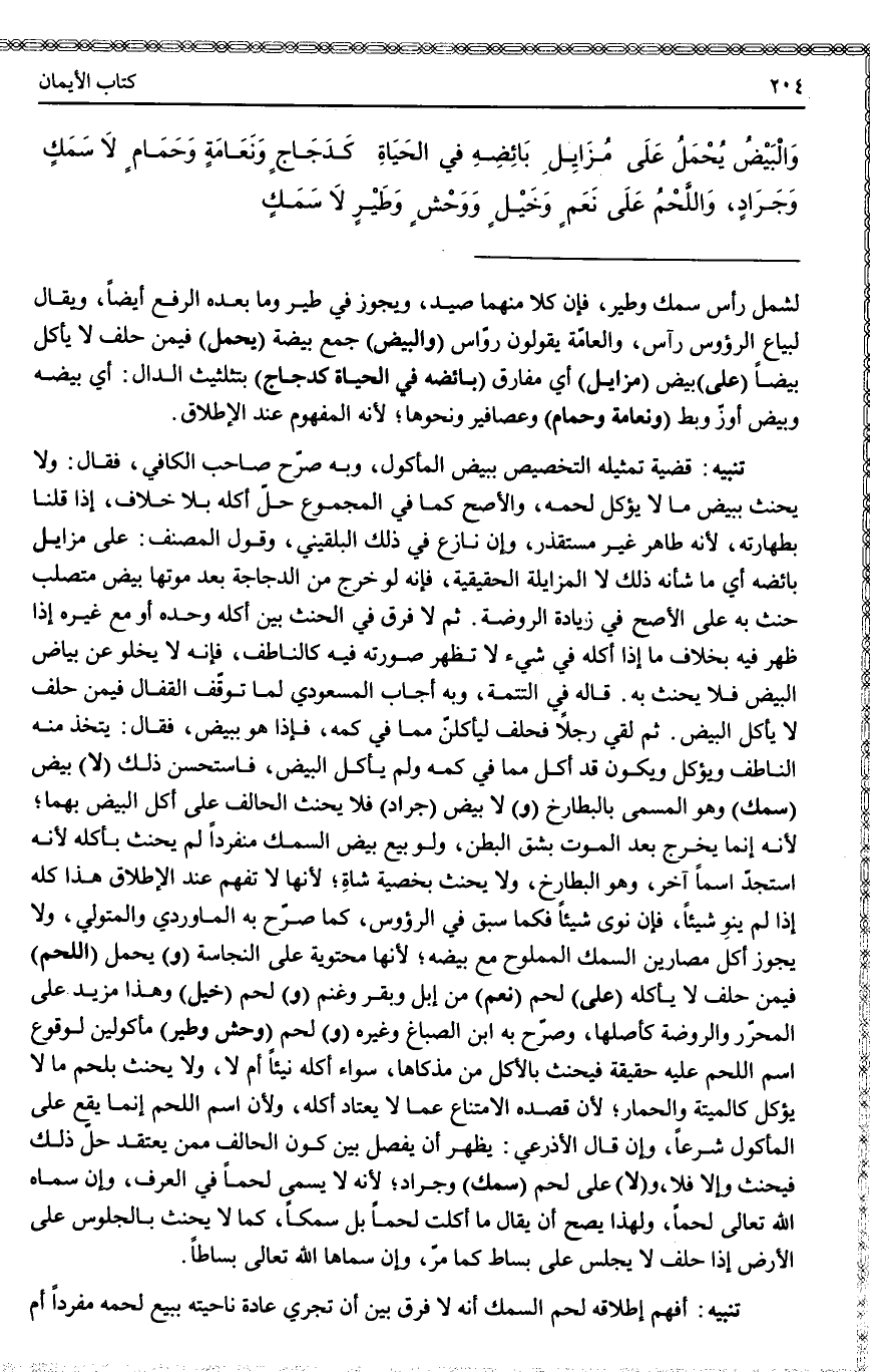 ـــــــــــــــــــــــــــــQلَشَمِلَ رَأْسَ سَمَكٍ وَطَيْرٍ، فَإِنَّ كُلًّا مِنْهُمَا صَيْدٌ، وَيَجُوزُ فِي طَيْرٍ وَمَا بَعْدَهُ الرَّفْعُ أَيْضًا، وَيُقَالُ لِبَيَّاعِ الرُّءُوسِ رَآَّسٌ، وَالْعَامَّةُ يَقُولُونَ رَوَّاسٌ (وَالْبَيْضُ) جَمْعُ بَيْضَةٍ (يُحْمَلُ) فِيمَنْ حَلَفَ لَا يَأْكُلُ بَيْضًا (عَلَى) بَيْضٍ (مُزَايِلٍ) أَيْ مُفَارِقٍ (بَائِضَهُ فِي الْحَيَاةِ كَدَجَاجٍ) بِتَثْلِيثِ الدَّالِ: أَيْ بَيْضِهِ وَبَيْضِ إوَزٍّ وَبَطٍّ (وَنَعَامَةٍ وَحَمَامٍ) وَعَصَافِيرَ وَنَحْوِهَا؛ لِأَنَّهُ الْمَفْهُومُ عِنْدَ الْإِطْلَاقِ.