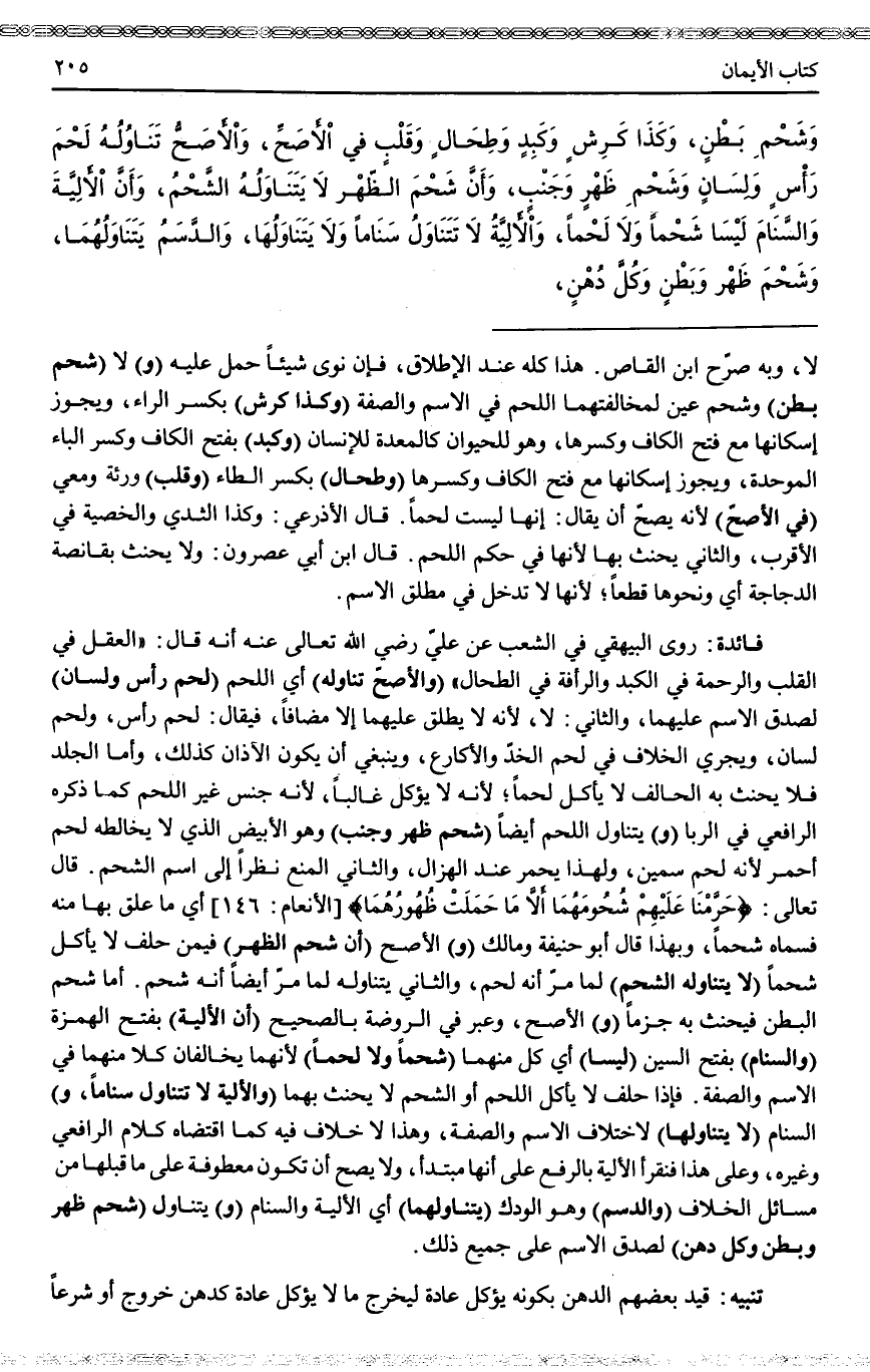 وَشَحْمِ بَطْنٍ، وَكَذَا كَرِشٍ وَكَبِدٍ وَطِحَالٍ وَقَلْبٍ فِي الْأَصَحّ، وَالْأَصَحُّ تَنَاوُلُهُ لَحْمَ رَأْسٍ وَلِسَانٍ وَشَحْمِ ظَهْرٍ وَجَنْبٍ، وَأَنَّ شَحْمَ الظَّهَرِ لَا يَتَنَاوَلُهُ الشَّحْمُ، وَأَنَّ الْأَلْيَةَ وَالسَّنَامَ لَيْسَا شَحْمًا وَلَا لَحْمًا، وَالْأَلْيَةُ لَا تَتَنَاوَلُ سَنَامًا وَلَا يَتَنَاوَلُهَا، وَالدَّسَمُ يَتَنَاوَلُهُمَا، وَشَحْمَ ظَهْرٍ وَبَطْنٍ وَكُلَّ دُهْنٍ،