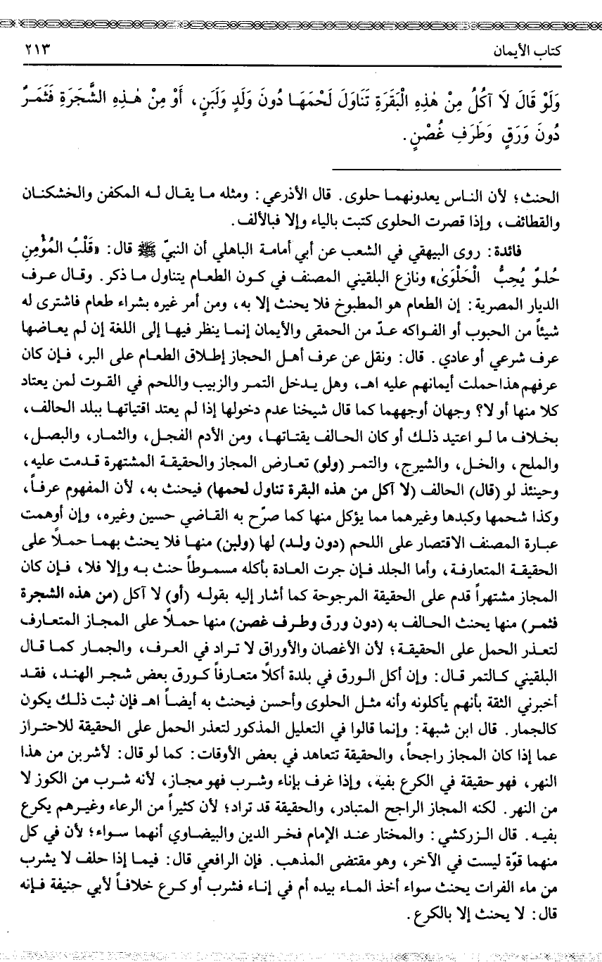 فَائِدَةٌ: رَوَى الْبَيْهَقِيُّ فِي الشُّعَبِ عَنْ أَبِي أُمَامَةَ الْبَاهِلِيِّ أَنَّ النَّبِيَّ - صَلَّى اللَّهُ عَلَيْهِ وَسَلَّمَ - قَالَ: «قَلْبُ الْمُؤْمِنِ حُلْوٌ يُحِبُّ الْحَلْوَى» وَنَازَعَ الْبُلْقِينِيُّ الْمُصَنِّفَ فِي كَوْنِ الطَّعَامِ يَتَنَاوَلُ مَا ذَكَرَ. وَقَالَ عُرْفُ الدِّيَارِ الْمِصْرِيَّةِ: أَنَّ الطَّعَامَ هُوَ الْمَطْبُوخُ فَلَا يَحْنَثُ إلَّا بِهِ، وَمَنْ أَمَرَ غَيْرَهُ بِشِرَاءِ طَعَامٍ فَاشْتَرَى لَهُ شَيْئًا مِنْ الْحُبُوبِ أَوْ الْفَوَاكِهِ عُدَّ مِنْ الْحَمْقَى وَالْأَيْمَانُ إنَّمَا يُنْظَرُ فِيهَا إلَى اللُّغَةِ إنْ لَمْ يُعَضِّدْهَا عُرْفٌ شَرْعِيٌّ أَوْ عَادِيٌّ. قَالَ: وَنُقِلَ عَنْ عُرْفِ أَهْلِ الْحِجَازِ إطْلَاقُ الطَّعَامِ عَلَى الْبُرِّ، فَإِنْ كَانَ عُرْفُهُمْ هَذَا حُمِلَتْ أَيْمَانُهُمْ عَلَيْهِ اهـ.