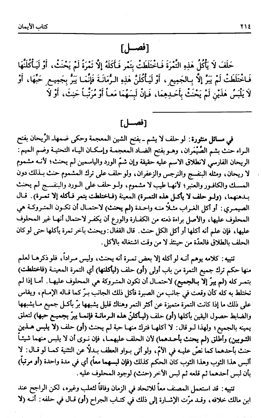 [فَصْلٌ] فِي مَسَائِلَ مَنْثُورَةٍ: لَوْ حَلَفَ لَا يَشَمُّ - بِفَتْحِ الشِّينِ الْمُعْجَمَةِ وَحُكِيَ ضَمُّهَا - الرَّيْحَانَ بِفَتْحِ الرَّاءِ حَنِثَ بِشَمِّ الصَّيْمَرَانِ، وَهُوَ بِفَتْحِ الصَّادِ الْمُعْجَمَةِ وَإِسْكَانِ الْيَاءِ التَّحْتِيَّةِ وَضَمِّ الْمِيمِ: الرَّيْحَانُ الْفَارِسِيِّ لِانْطِلَاقِ الِاسْمِ عَلَيْهِ حَقِيقَةً وَإِنْ شَمَّ الْوَرْدَ وَالْيَاسَمِينَ لَمْ يَحْنَثْ؛ لِأَنَّهُ مَشْمُومٌ لَا رَيْحَانٌ، وَمِثْلُهُ الْبَنَفْسَجُ وَالنَّرْجِسُ وَالزَّعْفَرَانُ، وَلَوْ حَلَفَ عَلَى تَرْكِ الْمَشْمُومِ حَنِثَ بِذَلِكَ دُونَ الْمِسْكِ وَالْكَافُورِ وَالْعَنْبَرِ؛ لِأَنَّهَا طِيبٌ لَا مَشْمُومٌ، وَلَوْ حَلَفَ عَلَى الْوَرْدِ وَالْبَنَفْسَجِ لَمْ يَحْنَثْ بِدُهْنِهِمَا.