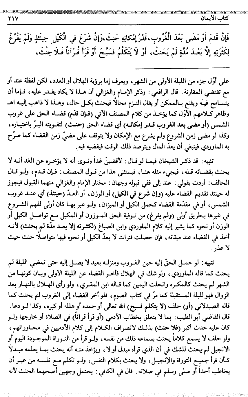 وَظَاهِرُ كَلَامِهِمْ الْأَوَّلِ كَمَا يُؤْخَذُ مِنْ كَلَامِ الْمُصَنِّفِ الْآتِي (فَإِنْ قَدِمَ) قَضَاءُ الْحَقِّ عَلَى غُرُوبِ الشَّمْسِ (أَوْ مَضَى بَعْدَ الْغُرُوبِ قَدْرُ إمْكَانِهِ) أَيْ قَضَاءِ الْحَقِّ (حَنِثَ) لِتَفْوِيتِهِ الْبِرَّ بِاخْتِيَارِهِ، وَكَذَا لَوْ مَضَى زَمَنُ الشُّرُوعِ وَلَمْ يَشْرَعْ مَعَ الْإِمْكَانِ، وَلَا يَتَوَقَّفُ عَلَى مُضِيِّ زَمَنِ الْقَضَاءِ كَمَا صَرَّحَ بِهِ الْمَاوَرْدِيُّ فَيَنْبَغِي أَنْ يَعُدَّ الْمَالَ وَيَتَرَصَّدَ ذَلِكَ الْوَقْتَ فَيَقْضِيَهُ فِيهِ.