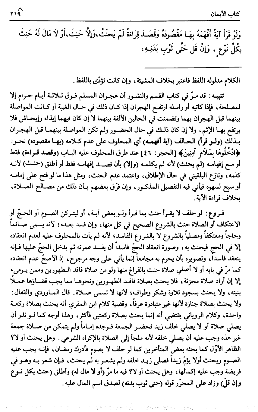 (وَلَوْ) (قَرَأَ) الْحَالِفُ (آيَةً أَفْهَمَهُ) أَيْ الْمَحْلُوفَ عَلَى عَدَمِ كَلَامِهِ (بِهَا مَقْصُودَهُ) نَحْوَ: (اُدْخُلُوهَا بِسَلَامٍ آمَنِينَ) عِنْدَ طَرْقِ الْمَحْلُوفِ عَلَيْهِ الْبَابَ (وَقَصَدَ قِرَاءَةً) فَقَطْ أَوْ مَعَ إفْهَامِهِ (لَمْ يَحْنَثْ) ؛ لِأَنَّهُ لَمْ يُكَلِّمْهُ (وَإِلَّا) بِأَنْ قَصَدَ إفْهَامَهُ فَقَطْ أَوْ أَطْلَقَ (حَنِثَ) لِأَنَّهُ كَلَّمَهُ، وَنَازَعَ الْبُلْقِينِيُّ فِي حَالِ الْإِطْلَاقِ، وَاعْتَمَدَ عَدَمَ الْحِنْثِ، وَمِثْلُ هَذَا مَا لَوْ فَتَحَ عَلَى إمَامِهِ أَوْ سَبَّحَ لِسَهْوِهِ فَيَأْتِي فِيهِ التَّفْصِيلُ الْمَذْكُورُ، وَإِنْ فَرَّقَ بَعْضُهُمْ بِأَنَّ ذَلِكَ مِنْ مَصَالِحِ الصَّلَاةِ، بِخِلَافِ قِرَاءَةِ الْآيَةِ.
