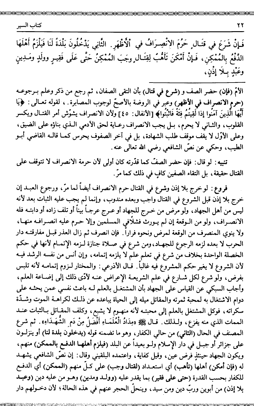 ـــــــــــــــــــــــــــــQالْأُمِّ (فَإِنْ) حَضَرَ الصَّفَّ وَ (شَرَعَ فِي قِتَالٍ) بِأَنْ الْتَقَى الصَّفَّانِ، ثُمَّ رَجَعَ مَنْ ذُكِرَ وَعَلِمَ بِرُجُوعِهِ (حَرُمَ الِانْصِرَافُ فِي الْأَظْهَرِ) وَعَبَّرَ فِي الرَّوْضَةِ بِالْأَصَحِّ لِوُجُوبِ الْمُصَابَرَةِ؛ لِقَوْلِهِ تَعَالَى: {يَا أَيُّهَا الَّذِينَ آمَنُوا إِذَا لَقِيتُمْ فِئَةً فَاثْبُتُوا} [الأنفال: 45] وَلِأَنَّ الِانْصِرَافَ يُشَوِّشُ أَمْرَ الْقِتَالِ وَيَكْسِرُ الْقُلُوبَ، وَالثَّانِي لَا يَحْرُمُ، بَلْ يَجِبُ الِانْصِرَافُ رِعَايَةً لِحَقِّ الْآدَمِيِّ الَّذِي بِنَاؤُهُ عَلَى الضَّيْقِ، وَعَلَى الْأَوَّلِ لَا يَقِفُ مَوْقِفَ طَلَبِ الشَّهَادَةِ، بَلْ فِي آخِرِ الصُّفُوفِ يَحْرُسُ كَمَا قَالَهُ الْقَاضِي أَبُو الطَّيِّبِ، وَحَكَى عَنْ نَصِّ الشَّافِعِيِّ - رَضِيَ اللَّهُ تَعَالَى عَنْهُ -.