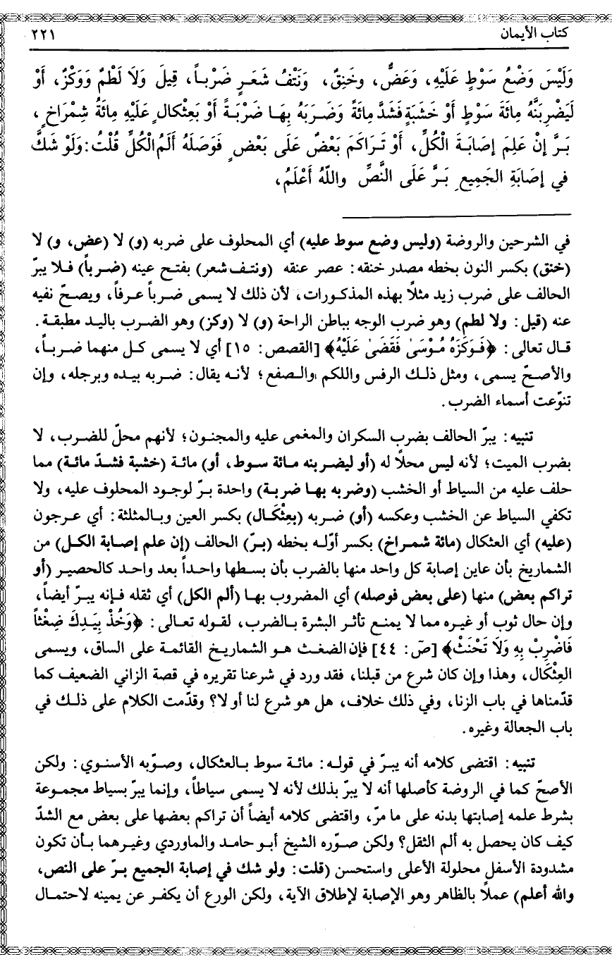 تَنْبِيهٌ: اقْتَضَى كَلَامُهُ أَنَّهُ يَبِرُّ فِي قَوْلِهِ: مِائَةَ سَوْطٍ بِالْعُثْكَالِ، وَصَوَّبَهُ الْإِسْنَوِيُّ: وَلَكِنَّ الْأَصَحَّ كَمَا فِي الرَّوْضَةِ كَأَصْلِهَا أَنَّهُ لَا يَبِرُّ بِذَلِكَ لِأَنَّهُ لَا يُسَمَّى سِيَاطًا، وَإِنَّمَا يَبِرُّ بِسِيَاطِ مَجْمُوعَةٍ بِشَرْطِ عِلْمِهِ إصَابَتَهَا بَدَنُهُ عَلَى مَا مَرَّ، وَاقْتَضَى كَلَامُهُ أَيْضًا إنْ تَرَاكَمَ بَعْضُهَا عَلَى بَعْضٍ مَعَ الشَّدِّ كَيْفَ كَانَ يَحْصُلُ بِهِ أَلَمُ الثِّقَلِ؟ وَلَكِنْ صَوَّرَهُ الشَّيْخُ أَبُو حَامِدٍ وَالْمَاوَرْدِيُّ وَغَيْرُهُمَا بِأَنْ تَكُونَ مَشْدُودَةَ الْأَسْفَلِ مَحْلُولَةَ الْأَعْلَى وَاسْتُحْسِنَ (قُلْت: وَلَوْ شَكَّ فِي إصَابَةِ الْجَمِيعِ بَرَّ عَلَى النَّصِّ، وَاَللَّهُ أَعْلَمُ) عَمَلًا بِالظَّاهِرِ وَهُوَ الْإِصَابَةُ لِإِطْلَاقِ الْآيَةِ، وَلَكِنَّ الْوَرَعَ أَنْ يُكَفِّرَ عَنْ يَمِينِهِ لِاحْتِمَالِ