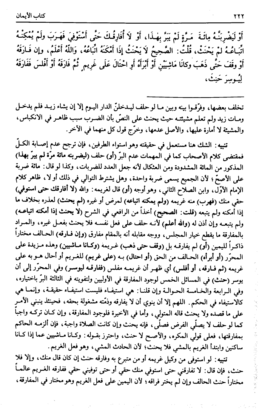 (أَوْ) قَالَ لِغَرِيمِهِ: وَاَللَّهِ (لَا أُفَارِقُك حَتَّى أَسْتَوْفِيَ) حَقِّي مِنْك (فَهَرَبَ) مِنْهُ غَرِيمُهُ (وَلَمْ يُمْكِنْهُ اتِّبَاعُهُ) لِمَرَضٍ أَوْ غَيْرِهِ (لَمْ يَحْنَثْ) لِعُذْرِهِ بِخِلَافِ مَا إذَا أَمْكَنَهُ وَلَمْ يَتَّبِعْهُ (قُلْت: الصَّحِيحُ) أَخْذًا مِنْ الرَّافِعِيِّ فِي الشَّرْحِ (لَا يَحْنَثُ إذَا أَمْكَنَهُ اتِّبَاعُهُ) وَلَمْ يَتَّبِعْهُ وَإِنْ أَذِنَ لَهُ (وَاَللَّهُ أَعْلَمُ) لِأَنَّهُ حَلَفَ عَلَى فِعْلِ نَفْسِهِ فَلَا يَحْنَثُ بِفِعْلِ غَيْرِهِ، وَالْمُرَادُ بِالْمُفَارَقَةِ مَا يَقْطَعُ خِيَارَ الْمَجْلِسِ، وَوَجْهُ مُقَابِلِهِ أَنَّهُ بِالْمَقَامِ مُفَارِقٌ (وَإِنْ فَارَقَهُ) الْحَالِفُ مُخْتَارًا ذَاكِرًا لِلْيَمِينِ (أَوْ) لَمْ يُفَارِقْهُ بَلْ (وَقَفَ حَتَّى ذَهَبَ) غَرِيمُهُ (وَكَانَا مَاشِيَيْنِ) وَهَذِهِ مَزِيدَةٌ عَلَى الْمُحَرَّرِ (أَوْ أَبْرَأَهُ) الْحَالِفُ مِنْ الْحَقِّ (أَوْ احْتَالَ) بِهِ (عَلَى غَرِيمٍ) لِلْغَرِيمِ أَوْ أَحَالَ هُوَ بِهِ عَلَى غَرِيمِهِ (ثُمَّ فَارَقَهُ، أَوْ أَفْلَسَ) أَيْ ظَهَرَ أَنْ غَرِيمَهُ مُفْلِسٌ (فَفَارَقَهُ لِيُوسِرَ) وَفِي الْمُحَرَّرِ إلَى أَنْ يُوسِرَ (حَنِثَ) فِي الْمَسَائِلِ الْخَمْسِ لِوُجُودِ الْمُفَارَقَةِ فِي الْأَوَّلِيَّيْنِ وَلِتَفْوِيتِهِ فِي الثَّالِثَةِ الْبِرَّ بِاخْتِيَارِهِ، وَفِي الرَّابِعَةِ وَالْخَامِسَةِ الْحَوَالَةَ وَإِنْ قُلْنَا: هِيَ اسْتِيفَاءٌ فَلَيْسَتْ اسْتِيفَاءً حَقِيقَةً، وَإِنَّمَا هِيَ كَالِاسْتِيفَاءِ فِي الْحُكْمِ. اللَّهُمَّ إلَّا أَنْ يَنْوِيَ أَنْ لَا يُفَارِقَهُ وَذِمَّتُهُ مَشْغُولَةٌ بِحَقِّهِ، فَحِينَئِذٍ يَنْبَنِي الْأَمْرُ عَلَى مَا قَصَدَهُ وَلَا يَحْنَثُ قَالَهُ الْمُتَوَلِّي، وَأَمَّا فِي الْأَخِيرَةِ فَلِوُجُودِ الْمُفَارَقَةِ، وَإِنْ كَانَ تَرْكُهُ وَاجِبًا كَمَا لَوْ حَلَفَ لَا يُصَلِّي الْفَرْضَ فَصَلَّى، فَإِنَّهُ يَحْنَثُ وَإِنْ كَانَتْ الصَّلَاةُ وَاجِبَةً، فَإِنْ أَلْزَمَهُ الْحَاكِمُ بِمُفَارَقَتِهَا، فَعَلَى قَوْلَيْ الْمُكْرَهِ، وَالْأَصَحُّ لَا حِنْثَ، وَاحْتَرَزَ بِقَوْلِهِ: وَكَانَا مَاشِيَيْنِ عَمَّا إذَا كَانَا سَاكِنَيْنِ وَابْتَدَأَ الْغَرِيمُ بِالْمَشْيِ فَلَا يَحْنَثُ؛ لِأَنَّ الْحَادِثَ الْمَشْيُ، وَهُوَ فِعْلُ الْغَرِيمِ.