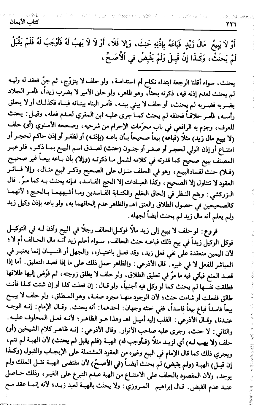 (أَوْ) حَلَفَ (لَا يَبِيعُ مَالَ زَيْدٍ) مَثَلًا (فَبَاعَهُ) بَيْعًا صَحِيحًا بِأَنْ بَاعَهُ (بِإِذْنِهِ) أَوْ لِظَفَرٍ أَوْ إذْنِ حَاكِمٍ لِحَجْرٍ أَوْ امْتِنَاعٍ أَوْ إذْنِ الْوَلِيِّ لِحَجْرٍ أَوْ صِغَرٍ أَوْ جُنُونٍ (حَنِثَ) لِصِدْقِ اسْمِ الْبَيْعِ بِمَا ذُكِرَ، فَلَوْ عَبَّرَ الْمُصَنِّفُ بِبَيْعٍ صَحِيحٍ كَمَا قَدَّرْته فِي كَلَامِهِ لَشَمِلَ مَا ذَكَرْته (وَإِلَّا) بِأَنْ بَاعَهُ بَيْعًا غَيْرَ صَحِيحٍ (فَلَا) حِنْثَ لِفَسَادِ الْبَيْعِ، وَهُوَ فِي الْحَلِفِ مُنَزَّلٌ عَلَى الصَّحِيحِ وَذِكْرُ الْبَيْعِ مِثَالٌ، وَإِلَّا فَسَائِرُ الْعُقُودِ لَا تَتَنَاوَلُ إلَّا الصَّحِيحَ، وَكَذَا الْعِبَادَاتُ إلَّا الْحَجَّ الْفَاسِدَ، فَإِنَّهُ يَحْنَثُ بِهِ كَمَا مَرَّ. قَالَ الزَّرْكَشِيُّ: وَيَقَعُ النَّظَرُ فِي إلْحَاقِ الْخُلْعِ وَالْكِتَابَةِ الْفَاسِدَيْنِ وَمَا أَشْبَهَهُمَا بِالْحَجِّ؛ لِأَنَّهُمَا كَالصَّحِيحَيْنِ فِي حُصُولِ الطَّلَاقِ وَالْعِتْقِ اهـ.