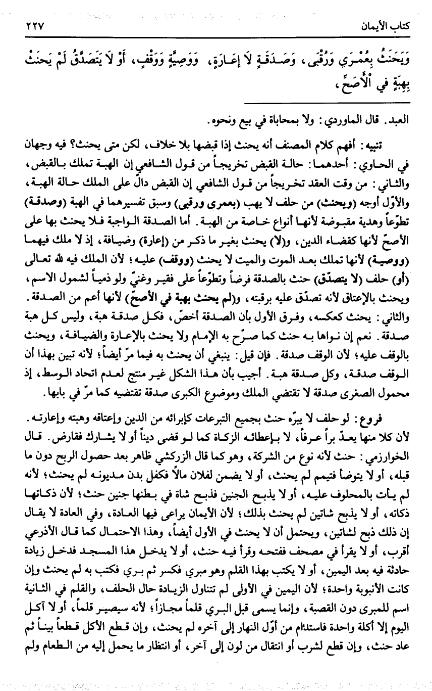 فُرُوعٌ: لَوْ حَلَفَ لَا يَبِرُّهُ حَنِثَ بِجَمِيعِ التَّبَرُّعَاتِ كَإِبْرَائِهِ مِنْ الدَّيْنِ وَإِعْتَاقِهِ وَهِبَتِهِ وَإِعَارَتِهِ. لِأَنَّ كُلًّا مِنْهَا يُعَدُّ بِرًّا عُرْفًا، لَا بِإِعْطَائِهِ الزَّكَاةَ كَمَا لَوْ قَضَى دَيْنًا أَوْ لَا يُشَارِكُ فَقَارَضَ. قَالَ الْخُوَارِزْمِيُّ: حَنِثَ لِأَنَّهُ نَوْعٌ مِنْ الشَّرِكَةِ، وَهُوَ كَمَا قَالَ الزَّرْكَشِيُّ ظَاهِرٌ بَعْدَ حُصُولِ الرِّبْحِ دُونَ مَا قَبْلَهُ، أَوْ لَا يَتَوَضَّأُ فَتَيَمَّمَ لَمْ يَحْنَثْ، أَوْ لَا يَضْمَنُ لِفُلَانٍ مَالًا فَكَفَلَ بَدَنَ مَدْيُونِهِ لَمْ يَحْنَثْ؛ لِأَنَّهُ لَمْ يَأْتِ بِالْمَحْلُوفِ عَلَيْهِ، أَوْ لَا يَذْبَحُ الْجَنِينَ فَذَبَحَ شَاةً فِي بَطْنِهَا جَنِينٌ حَنِثَ؛ لِأَنَّ ذَكَاتَهَا ذَكَاتُهُ، أَوْ لَا يَذْبَحُ شَاتَيْنِ لَمْ يَحْنَثْ بِذَلِكَ؛ لِأَنَّ الْأَيْمَانَ يُرَاعَى فِيهَا الْعَادَةُ، وَفِي الْعَادَةِ لَا يُقَالُ: إنَّ ذَلِكَ ذَبْحٌ لِشَاتَيْنِ، وَيُحْتَمَلُ أَنْ لَا يَحْنَثَ فِي الْأَوَّلِ أَيْضًا، وَهَذَا الِاحْتِمَالُ كَمَا قَالَ الْأَذْرَعِيُّ أَقْرَبُ، أَوْ لَا يَقْرَأُ فِي مُصْحَفٍ فَفَتَحَهُ وَقَرَأَ فِيهِ حَنِثَ، أَوْ لَا يَدْخُلُ هَذَا الْمَسْجِدَ فَدَخَلَ زِيَادَةً حَادِثَةً فِيهِ بَعْدَ الْيَمِينِ، أَوْ لَا يَكْتُبُ بِهَذَا الْقَلَمِ وَهُوَ مَبْرِيٌّ فَكُسِرَ ثُمَّ بُرِيَ فَكَتَبَ بِهِ لَمْ يَحْنَثْ وَإِنْ كَانَتْ الْأُنْبُوبَةُ وَاحِدَةً؛ لِأَنَّ الْيَمِينَ فِي الْأُولَى لَمْ تَتَنَاوَلْ الزِّيَادَةُ حَالَ الْحَلِفِ، وَالْقَلَمُ فِي الثَّانِيَةِ اسْمٌ لِلْمَبْرِيِّ دُونَ الْقَصَبَةِ، وَإِنَّمَا يُسَمَّى قَبْلَ الْبَرْيِ قَلَمًا مَجَازًا؛ لِأَنَّهُ سَيَصِيرُ قَلَمًا، أَوْ لَا آكُلُ الْيَوْمَ إلَّا أَكْلَةً وَاحِدَةً فَاسْتَدَامَ مِنْ أَوَّلِ النَّهَارِ إلَى آخِرِهِ لَمْ يَحْنَثْ، وَإِنْ قَطَعَ الْأَكْلَ قَطْعًا بَيِّنًا ثُمَّ عَادَ حَنِثَ، وَإِنْ قَطَعَ لِشُرْبٍ أَوْ انْتِقَالٍ مِنْ لَوْنٍ إلَى آخَرَ، أَوْ انْتِظَارِ مَا يُحْمَلُ إلَيْهِ مِنْ الطَّعَامِ وَلَمْ