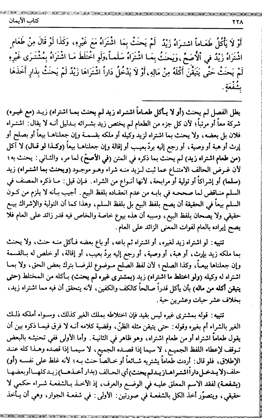 (أَوْ) حَلَفَ (لَا يَدْخُلُ دَارًا اشْتَرَاهَا زَيْدٌ لَمْ يَحْنَثْ) أَيْ الْحَالِفُ (بِدَارٍ أَخَذَهَا) زَيْدٌ كُلَّهَا أَوْ بَعْضَهَا (بِشُفْعَةٍ) لِفَقْدِ الِاسْمِ الْمُعَلَّقِ عَلَيْهِ فِي الْوَضْعِ وَالْعُرْفِ، إذْ الْأَخْذُ بِالشُّفْعَةِ شِرَاءٌ حُكْمِيٌّ لَا حَقِيقِيٌّ، وَيَتَصَوَّرُ أَخْذُ الْكُلِّ بِالشُّفْعَةِ فِي صُورَتَيْنِ: الْأُولَى: فِي شُفْعَةِ الْجِوَارِ، وَهِيَ أَنْ يَأْخُذَ