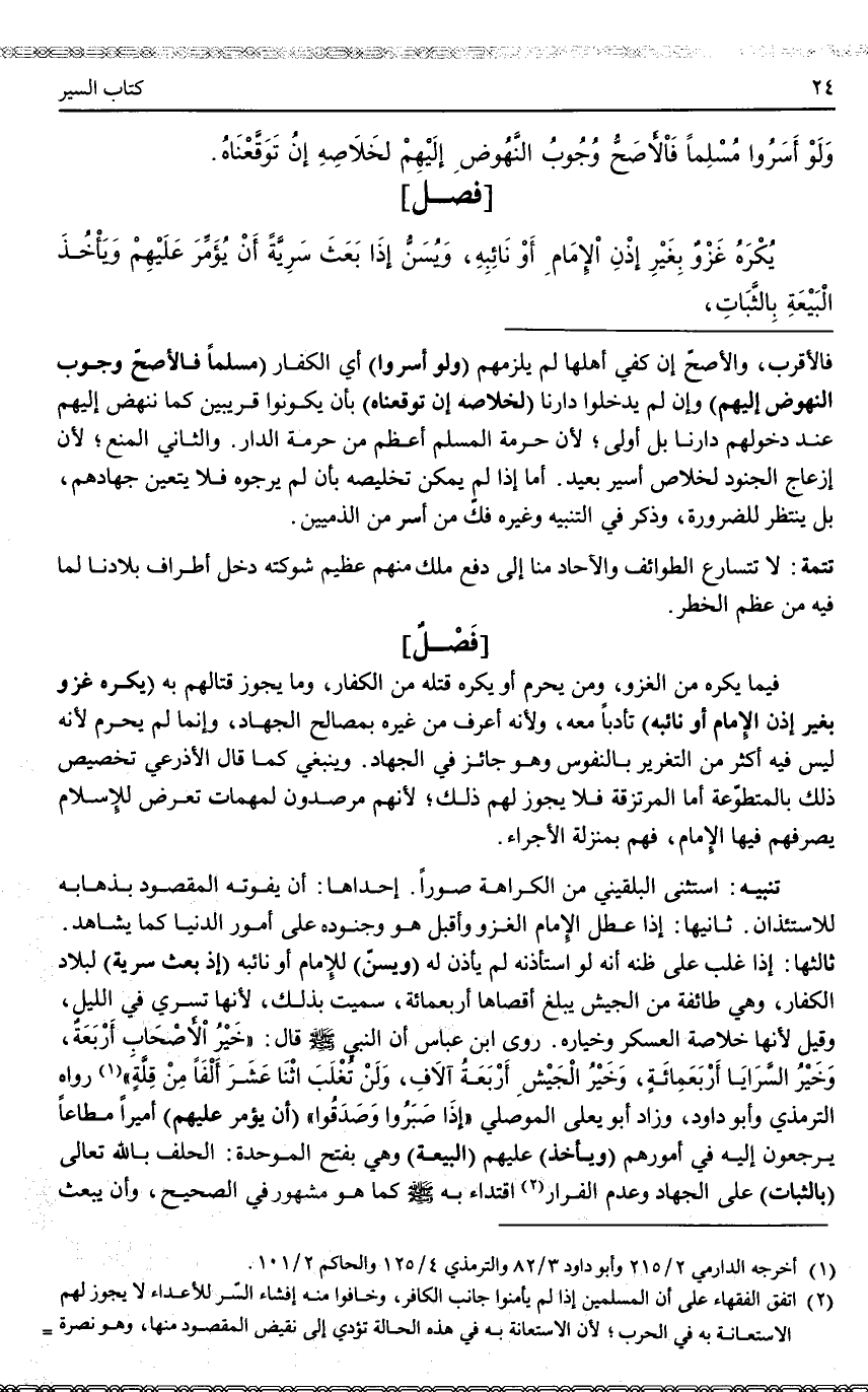 [فَصْلٌ] يُكْرَهُ غَزْوٌ بِغَيْرِ إذْنِ الْإِمَامِ أَوْ نَائِبِهِ.