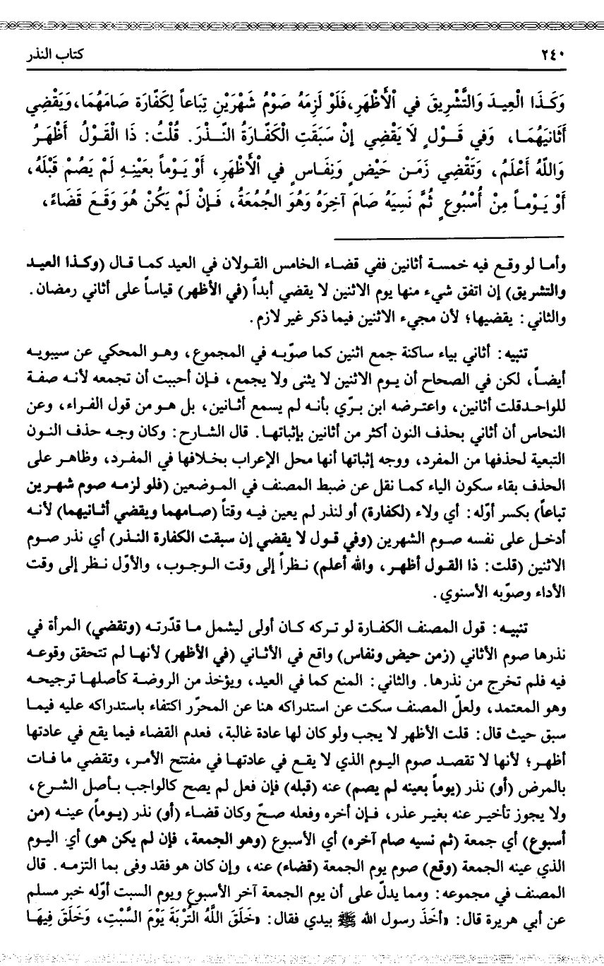 (أَوْ) نَذَرَ (يَوْمًا) عَيَّنَهُ (مِنْ أُسْبُوعٍ) أَيْ جُمُعَةٍ (ثُمَّ نَسِيَهُ) (صَامَ آخِرَهُ) أَيْ الْأُسْبُوعِ (وَهُوَ الْجُمُعَةُ، فَإِنْ لَمْ يَكُنْ هُوَ) أَيْ الْيَوْمُ الَّذِي عَيَّنَهُ الْجُمُعَةَ (وَقَعَ) صَوْمُ يَوْمِ الْجُمُعَةِ (قَضَاءً) عَنْهُ، وَإِنْ كَانَ هُوَ فَقَدْ وَفَّى بِمَا الْتَزَمَهُ. قَالَ الْمُصَنِّفُ فِي مَجْمُوعِهِ: وَمِمَّا يَدُلُّ عَلَى أَنَّ يَوْمَ الْجُمُعَةِ آخِرَ الْأُسْبُوعِ وَيَوْمَ السَّبْتِ أَوَّلُهُ خَبَرُ مُسْلِمٍ عَنْ أَبِي هُرَيْرَةَ قَالَ: