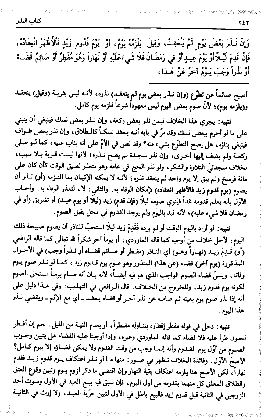 تَنْبِيهٌ: لَوْ أَرَادَ بِالْيَوْمِ الْوَقْتَ أَوْ لَمْ يُرِدْهُ فَقَدِمَ زَيْدٌ لَيْلًا اُسْتُحِبَّ لِلنَّاذِرِ أَنْ يَصُومَ صَبِيحَةَ ذَلِكَ الْيَوْمِ؛ لِأَجْلِ خِلَافِ مَنْ أَوْجَبَهُ كَمَا قَالَهُ الْمَاوَرْدِيُّ، أَوْ يَوْمًا آخَرَ شُكْرًا لِلَّهِ تَعَالَى كَمَا قَالَهُ الرَّافِعِيُّ (أَوْ) قَدِمَ زَيْدٌ (نَهَارًا وَهُوَ) أَيْ النَّاذِرُ (مُفْطِرٌ أَوْ صَائِمٌ قَضَاءً أَوْ نَذْرًا وَجَبَ) فِي الْأَحْوَالِ الْمَذْكُورَةِ (يَوْمٌ آخَرَ) قَضَاءً (عَنْ هَذَا) الْمَنْذُورِ وَهُوَ صَوْمُ يَوْمِ قُدُومِ زَيْدٍ، كَمَا لَوْ نَذَرَ صَوْمَ يَوْمِ وَفَاتِهِ، وَيُسَنُّ قَضَاءُ الصَّوْمِ الْوَاجِبِ الَّذِي هُوَ فِيهِ أَيْضًا؛ لِأَنَّهُ بَانَ أَنَّهُ صَامَ يَوْمًا مُسْتَحَقَّ الصَّوْمِ لِكَوْنِهِ يَوْمَ قُدُومِ زَيْدٍ، وَلِلْخُرُوجِ مِنْ الْخِلَافِ. قَالَ الرَّافِعِيُّ فِي التَّهْذِيبِ: وَفِي هَذَا دَلِيلٌ عَلَى أَنَّهُ إذَا نَذَرَ صَوْمَ يَوْمٍ بِعَيْنِهِ ثُمَّ صَامَهُ عَنْ نَذْرٍ آخَرَ أَوْ قَضَاءٍ يَنْعَقِدُ أَيْ مَعَ الْإِثْمِ وَيَقْضِي نَذْرَ هَذَا الْيَوْمِ.