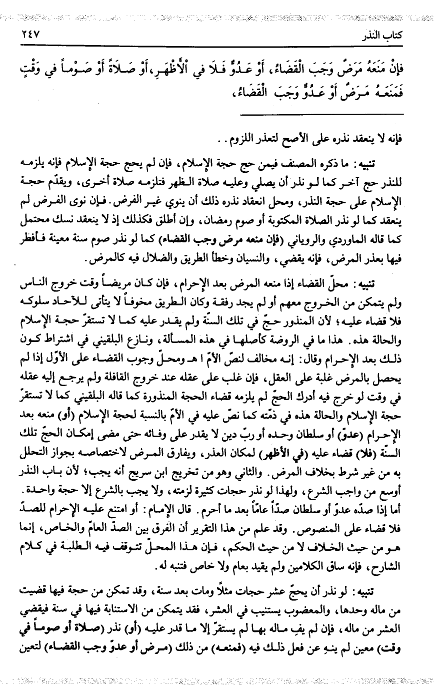 تَنْبِيهٌ: مَا ذَكَرَهُ الْمُصَنِّفُ فِيمَنْ حَجَّ حَجَّةَ الْإِسْلَامِ، فَإِنْ لَمْ يَحُجَّ حَجَّةَ الْإِسْلَامِ فَإِنَّهُ يَلْزَمُهُ لِلنَّذْرِ حَجٌّ آخَرُ كَمَا لَوْ نَذَرَ أَنْ يُصَلِّيَ وَعَلَيْهِ صَلَاةُ الظُّهْرِ فَتَلْزَمُهُ صَلَاةٌ أُخْرَى، وَيُقَدِّمُ حَجَّةَ الْإِسْلَامِ عَلَى حَجَّةِ النَّذْرِ، وَمَحَلُّ انْعِقَادِ نَذْرِهِ ذَلِكَ أَنْ يَنْوِيَ غَيْرَ الْفَرْضِ. فَإِنْ نَوَى الْفَرْضَ لَمْ يَنْعَقِدْ كَمَا لَوْ نَذَرَ الصَّلَاةَ الْمَكْتُوبَةَ أَوْ صَوْمَ رَمَضَانَ، وَإِنْ أَطْلَقَ فَكَذَلِكَ إذْ لَا يَنْعَقِدُ نُسُكٌ مُحْتَمَلٌ كَمَا قَالَهُ الْمَاوَرْدِيُّ وَالرُّويَانِيُّ (فَإِنْ مَنَعَهُ مَرَضٌ وَجَبَ الْقَضَاءُ) كَمَا لَوْ نَذَرَ صَوْمَ سَنَةٍ مُعَيَّنَةٍ فَأَفْطَرَ فِيهَا بِعُذْرِ الْمَرَضِ، فَإِنَّهُ يَقْضِي، وَالنِّسْيَانُ وَخَطَأُ الطَّرِيقِ وَالضَّلَالُ فِيهِ كَالْمَرَضِ.