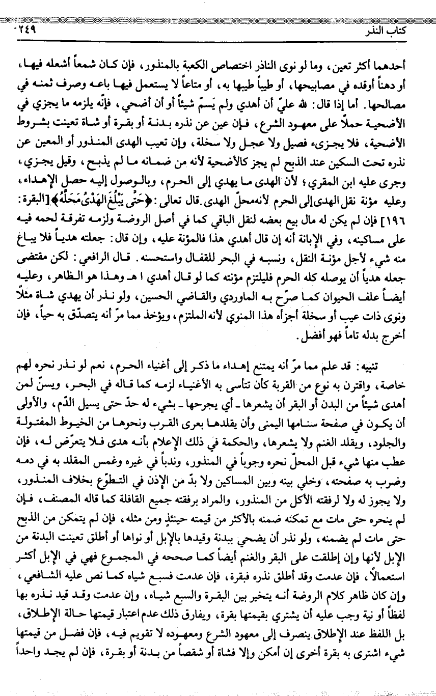 ـــــــــــــــــــــــــــــQأَحَدِهِمَا أَكْثَرَ تَعَيُّنٍ، وَمَا لَوْ نَوَى النَّاذِرُ اخْتِصَاصَ الْكَعْبَةِ بِالْمَنْذُورِ، فَإِنْ كَانَ شَمْعًا أَشْعَلَهُ فِيهَا، أَوْ دُهْنًا أَوْقَدَهُ فِي مَصَابِيحِهَا، أَوْ طِيبًا طَيَّبَهَا بِهِ، أَوْ مَتَاعًا لَا يُسْتَعْمَلُ فِيهَا بَاعَهُ وَصَرَفَ ثَمَنَهُ فِي مَصَالِحِهَا. أَمَّا إذَا قَالَ: لِلَّهِ عَلَيَّ أَنْ أُهْدِيَ وَلَمْ يُسَمِّ شَيْئًا أَوْ أَنْ أُضَحِّيَ، فَإِنَّهُ يَلْزَمُهُ مَا يُجْزِئُ فِي الْأُضْحِيَّةِ حَمْلًا عَلَى مَعْهُودِ الشَّرْعِ، فَإِنْ عَيَّنَ عَنْ نَذْرِهِ بَدَنَةً أَوْ بَقَرَةً أَوْ شَاةً تَعَيَّنَتْ بِشُرُوطِ الْأُضْحِيَّةِ، فَلَا يُجْزِئُ فَصِيلٌ وَلَا عِجْلٌ وَلَا سَخْلَةٌ.