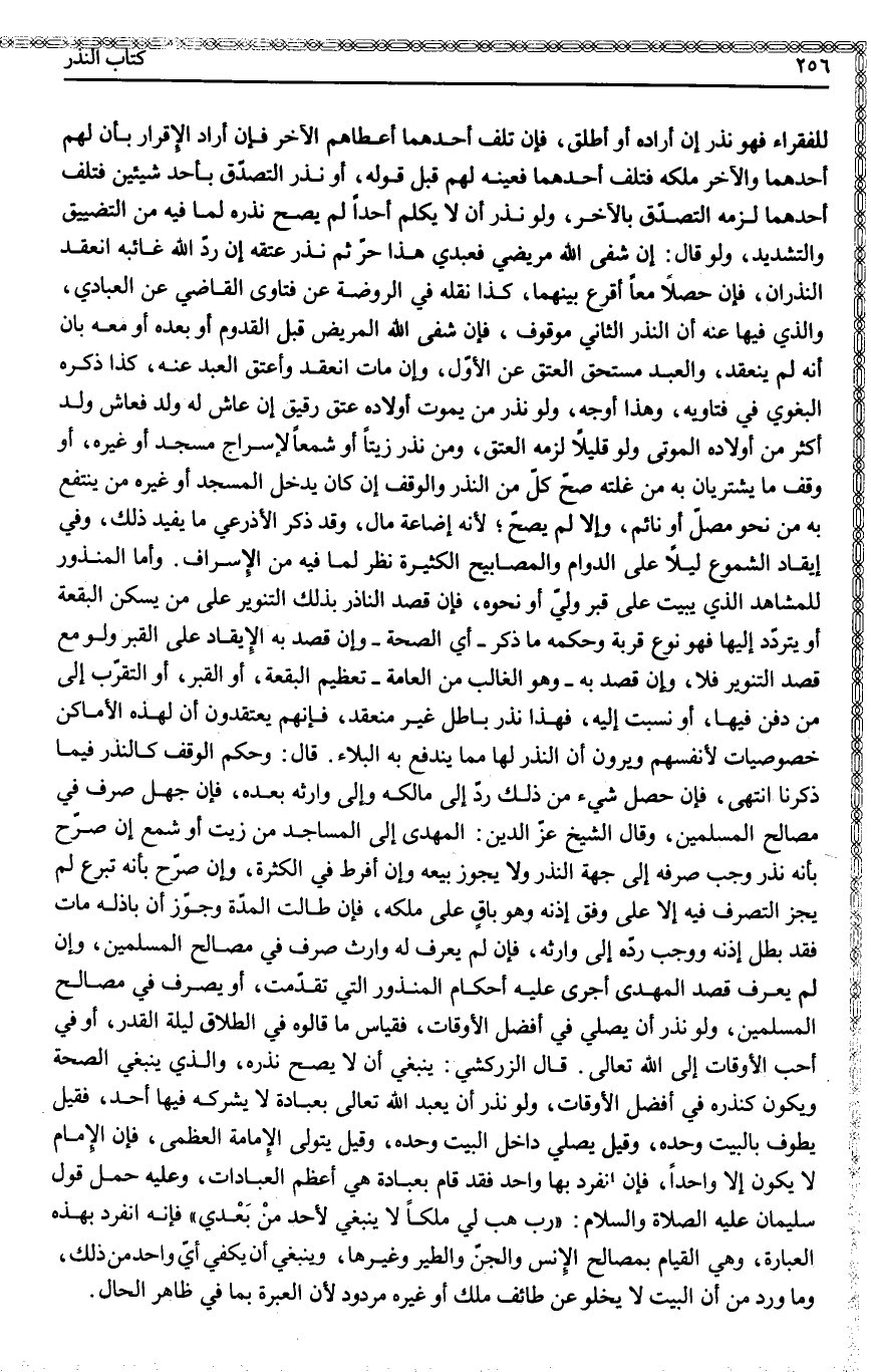 وَمَنْ نَذَرَ زَيْتًا أَوْ شَمْعًا لِإِسْرَاجِ مَسْجِدٍ أَوْ غَيْرِهِ، أَوْ وَقَفَ مَا يَشْتَرِيَانِ بِهِ مِنْ غَلَّتِهِ صَحَّ كُلٌّ مِنْ النَّذْرِ وَالْوَقْفِ إنْ كَانَ يَدْخُلُ الْمَسْجِدَ أَوْ غَيْرَهُ مَنْ يَنْتَفِعُ بِهِ مِنْ نَحْوِ مُصَلٍّ أَوْ نَائِمٍ، وَإِلَّا لَمْ يَصِحَّ؛ لِأَنَّهُ إضَاعَةُ مَالٍ، وَقَدْ ذَكَرَ الْأَذْرَعِيُّ مَا يُفِيدُ ذَلِكَ، وَفِي إيقَادِ الشُّمُوعِ لَيْلًا عَلَى الدَّوَامِ وَالْمَصَابِيحِ الْكَثِيرَةِ نَظَرٌ لِمَا فِيهِ مِنْ الْإِسْرَاف. وَأَمَّا الْمَنْذُورُ لِلْمُشَاهَدِ الَّذِي يَبِيتُ عَلَى قَبْرِ وَلِيٍّ أَوْ نَحْوِهِ، فَإِنْ قَصَدَ النَّاذِرُ بِذَلِكَ التَّنْوِيرَ عَلَى مَنْ يَسْكُنُ الْبُقْعَةَ أَوْ يَتَرَدَّدُ إلَيْهَا فَهُوَ نَوْعُ قُرْبَةٍ وَحُكْمُهُ مَا ذَكَرَ أَيْ الصِّحَّةُ وَإِنْ قَصَدَ بِهِ الْإِيقَادَ عَلَى الْقَبْرِ وَلَوْ مَعَ قَصْدِ التَّنْوِيرِ فَلَا، وَإِنْ قَصَدَ بِهِ وَهُوَ الْغَالِبُ مِنْ الْعَامَّةِ تَعْظِيمَ الْبُقْعَةِ أَوْ الْقَبْرِ، أَوْ التَّقَرُّبَ إلَى مَنْ دُفِنَ فِيهَا، أَوْ نُسِبَتْ إلَيْهِ، فَهَذَا نَذْرٌ بَاطِلٌ غَيْرُ مُنْعَقِدٍ، فَإِنَّهُمْ يَعْتَقِدُونَ أَنَّ لِهَذِهِ الْأَمَاكِنِ خُصُوصِيَّاتٍ لِأَنْفُسِهِمْ وَيَرَوْنَ أَنَّ النَّذْرَ لَهَا مِمَّا يَنْدَفِعُ بِهِ الْبَلَاءُ. قَالَ: وَحُكْمُ الْوَقْفِ كَالنَّذْرِ فِيمَا ذَكَرْنَا انْتَهَى، فَإِنْ حَصَلَ شَيْءٌ مِنْ ذَلِكَ رَدَّ إلَى مَالِكِهِ وَإِلَى وَارِثِهِ بَعْدَهُ، فَإِنْ جُهِلَ صُرِفَ فِي مَصَالِحِ الْمُسْلِمِينَ، وَقَالَ الشَّيْخُ عِزُّ الدِّينِ: الْمُهْدَى إلَى الْمَسَاجِدِ مِنْ زَيْتٍ أَوْ شَمْعٍ إنْ صَرَّحَ بِأَنَّهُ نَذْرٌ وَجَبَ صَرْفُهُ إلَى جِهَةِ النَّذْرِ وَلَا يَجُوزُ بَيْعُهُ وَإِنْ أَفْرَطَ فِي الْكَثْرَةِ، وَإِنْ صَرَّحَ بِأَنَّهُ تَبَرُّعٌ لَمْ يَجُزْ التَّصَرُّفُ فِيهِ إلَّا عَلَى وَفْقِ إذْنِهِ وَهُوَ بَاقٍ عَلَى مِلْكِهِ، فَإِنْ طَالَتْ الْمُدَّةُ وَجُوِّزَ أَنَّ بَاذِلَهُ مَاتَ فَقَدْ بَطَلَ إذْنُهُ وَوَجَبَ رَدُّهُ إلَى وَارِثِهِ، فَإِنْ لَمْ يُعْرَفْ لَهُ وَارِثٌ صُرِفَ فِي مَصَالِحِ الْمُسْلِمِينَ، وَإِنْ لَمْ يُعْرَفْ قَصْدُ الْمُهْدَى أَجْرَى عَلَيْهِ أَحْكَامَ الْمَنْذُورِ الَّتِي تَقَدَّمَتْ، أَوْ يُصْرَفُ فِي مَصَالِحِ الْمُسْلِمِينَ.