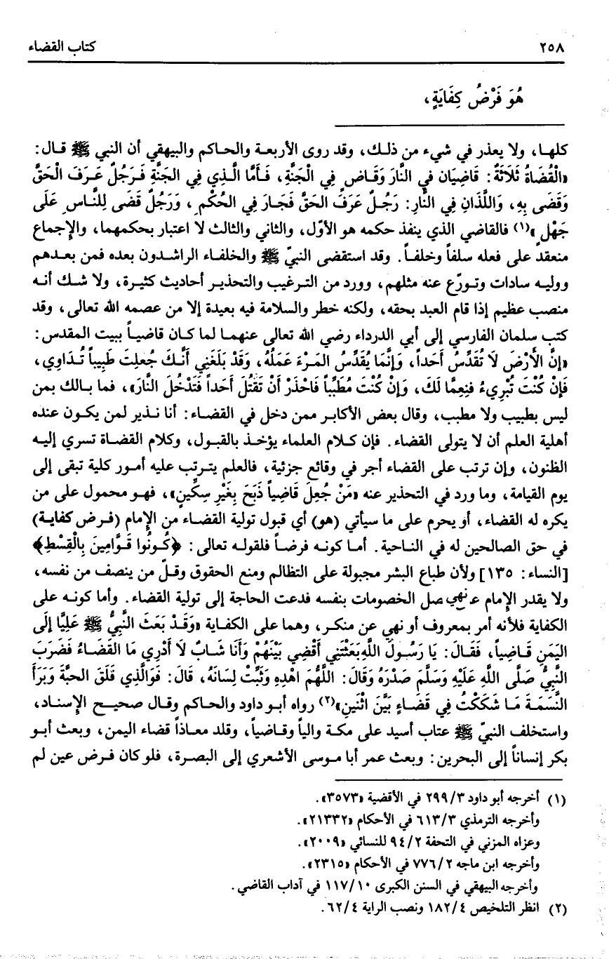 ـــــــــــــــــــــــــــــQكُلُّهَا، وَلَا يُعْذَرُ فِي شَيْءٍ مِنْ ذَلِكَ، وَقَدْ رَوَى الْأَرْبَعَةُ وَالْحَاكِمُ وَالْبَيْهَقِيُّ أَنَّ النَّبِيَّ - صَلَّى اللَّهُ عَلَيْهِ وَسَلَّمَ - قَالَ: «الْقُضَاةُ ثَلَاثَةٌ: قَاضِيَانِ فِي النَّارِ وَقَاضٍ فِي الْجَنَّةِ، فَأَمَّا الَّذِي فِي الْجَنَّةِ فَرَجُلٌ عَرَفَ الْحَقَّ وَقَضَى بِهِ، وَاَللَّذَانِ فِي النَّارِ: رَجُلٌ عَرَفَ الْحَقَّ فَجَارَ فِي الْحُكْمِ، وَرَجُلٌ قَضَى لِلنَّاسِ عَلَى جَهْلٍ» فَالْقَاضِي الَّذِي يَنْفُذُ حُكْمُهُ هُوَ الْأَوَّلُ، وَالثَّانِي وَالثَّالِثُ لَا اعْتِبَارَ بِحُكْمِهِمَا، وَالْإِجْمَاعُ مُنْعَقِدٌ عَلَى فِعْلِهِ سَلَفًا وَخَلَفًا. وَقَدْ اسْتَقْضَى النَّبِيُّ - صَلَّى اللَّهُ عَلَيْهِ وَسَلَّمَ - وَالْخُلَفَاءُ الرَّاشِدُونَ بَعْدَهُ فَمَنْ بَعْدَهُمْ وَوَلِيَهُ سَادَاتٌ وَتَوَرَّعَ عَنْهُ مِثْلُهُمْ، وَوَرَدَ مِنْ التَّرْغِيبِ وَالتَّحْذِيرِ أَحَادِيثُ كَثِيرَةٌ، وَلَا شَكَّ أَنَّهُ مَنْصِبٌ عَظِيمٌ إذَا قَامَ الْعَبْدُ بِحَقِّهِ، وَلَكِنَّهُ خَطِرٌ وَالسَّلَامَةُ فِيهِ بَعِيدَةٌ إلَّا مَنْ عَصَمَهُ اللَّهُ تَعَالَى وَقَدْ كَتَبَ سَلْمَانُ الْفَارِسِيُّ إلَى أَبِي الدَّرْدَاءِ - رَضِيَ اللَّهُ تَعَالَى عَنْهُمَا - لَمَّا كَانَ قَاضِيًا بِبَيْتِ الْمَقْدِسِ: " إنَّ الْأَرْضَ لَا تُقَدِّسُ أَحَدًا، وَإِنَّمَا يُقَدِّسُ الْمَرْءَ عَمَلُهُ، وَقَدْ بَلَغَنِي أَنَّك جُعِلْت طَبِيبًا تُدَاوِي، فَإِنْ كُنْت تُبْرِئُ فَنِعِمَّا لَك، وَإِنْ كُنْت مُطَبِّبًا فَاحْذَرْ أَنْ تَقْتُلَ أَحَدًا فَتَدْخُلَ النَّارَ "، فَمَا بَالُك بِمَنْ لَيْسَ بِطَبِيبٍ وَلَا مُطَبِّبٍ، وَقَالَ بَعْضُ الْأَكَابِرِ مِمَّنْ دَخَلَ فِي الْقَضَاءِ: أَنَا نَذِيرٌ لِمَنْ يَكُونُ عِنْدَهُ أَهْلِيَّةُ الْعِلْمِ أَنْ لَا يَتَوَلَّى الْقَضَاءَ. فَإِنَّ كَلَامَ الْعُلَمَاءِ يُؤْخَذُ بِالْقَبُولِ، وَكَلَامَ الْقُضَاةِ تَسْرِي إلَيْهِ الظُّنُونُ، وَإِنْ تَرَتَّبَ عَلَى الْقَضَاءِ أَجْرٌ فِي وَقَائِعَ جُزْئِيَّةٍ، فَالْعِلْمُ يَتَرَتَّبُ عَلَيْهِ أُمُورٌ كُلِّيَّةٌ تَبْقَى إلَى يَوْمِ الْقِيَامَةِ، وَمَا وَرَدَ فِي التَّحْذِيرِ عَنْهُ «مَنْ جُعِلَ قَاضِيًا ذُبِحَ بِغَيْرِ سِكِّينٍ» ، فَهُوَ مَحْمُولٌ عَلَى مَنْ يُكْرَهُ لَهُ الْقَضَاءُ، أَوْ يَحْرُمُ عَلَى مَا سَيَأْتِي (هُوَ) أَيْ قَبُولُ تَوْلِيَةِ الْقَضَاءِ مِنْ الْإِمَامِ (فَرْضُ كِفَايَةٍ) فِي حَقِّ الصَّالِحِينَ لَهُ فِي النَّاحِيَةِ.